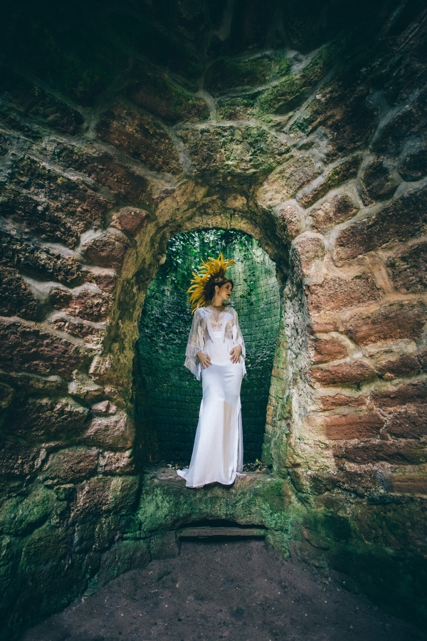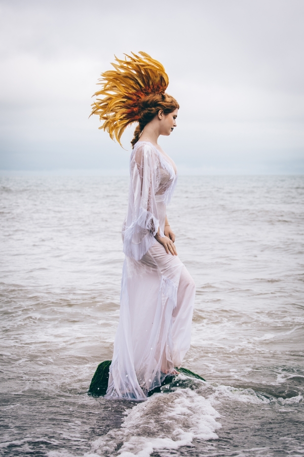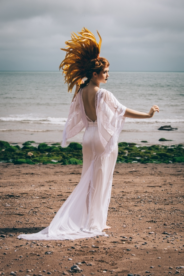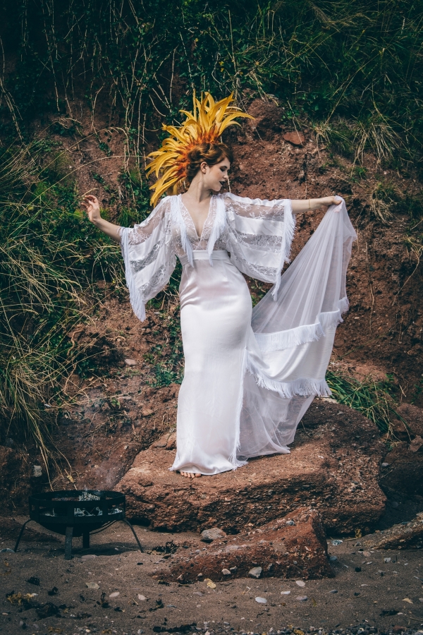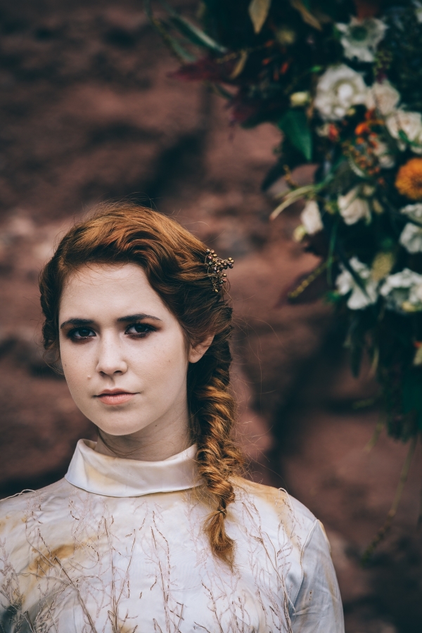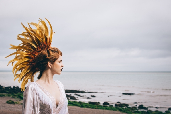 "The look for the model - red-haired of course to complement the colour palette - is dramatic and boho," says Nikki. "We wanted a strong editorial look with dark eyes and make-up, beautiful braids and the most stunning amber feather headdress."