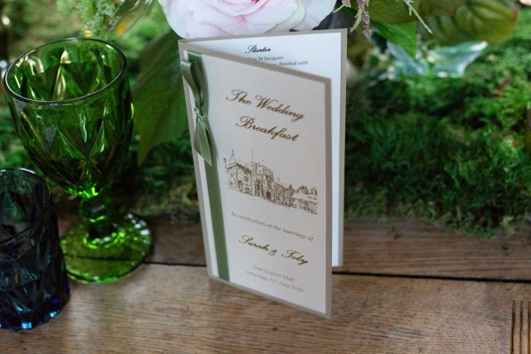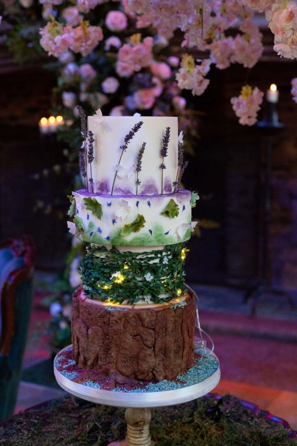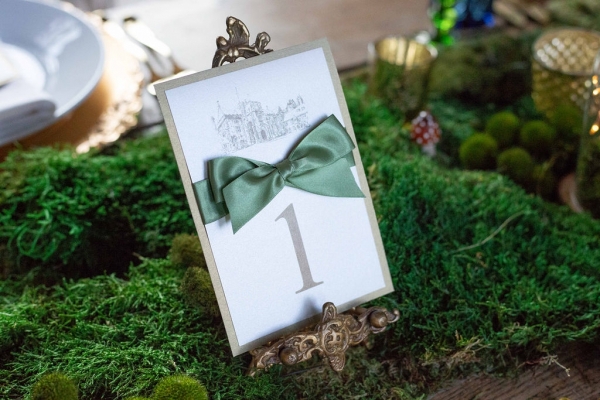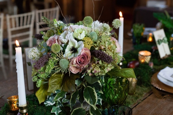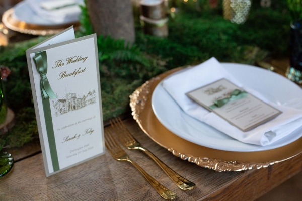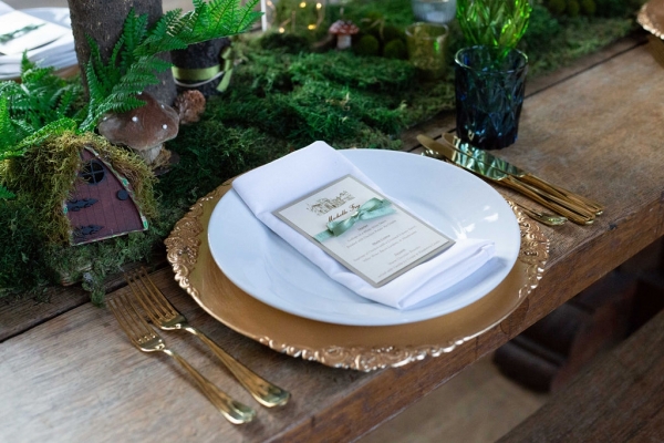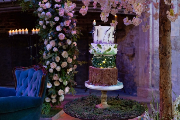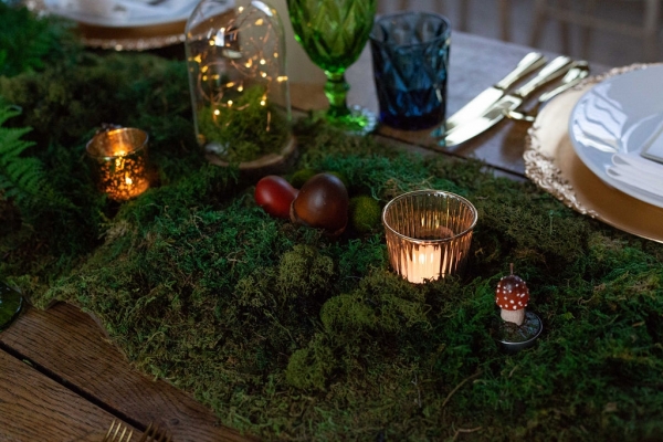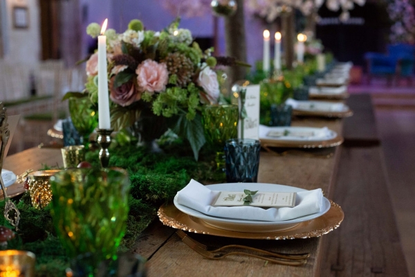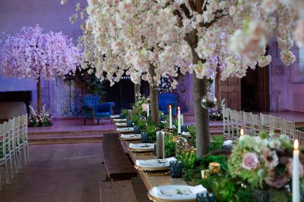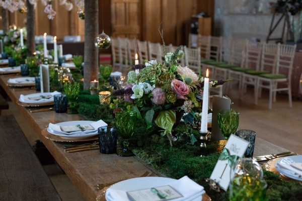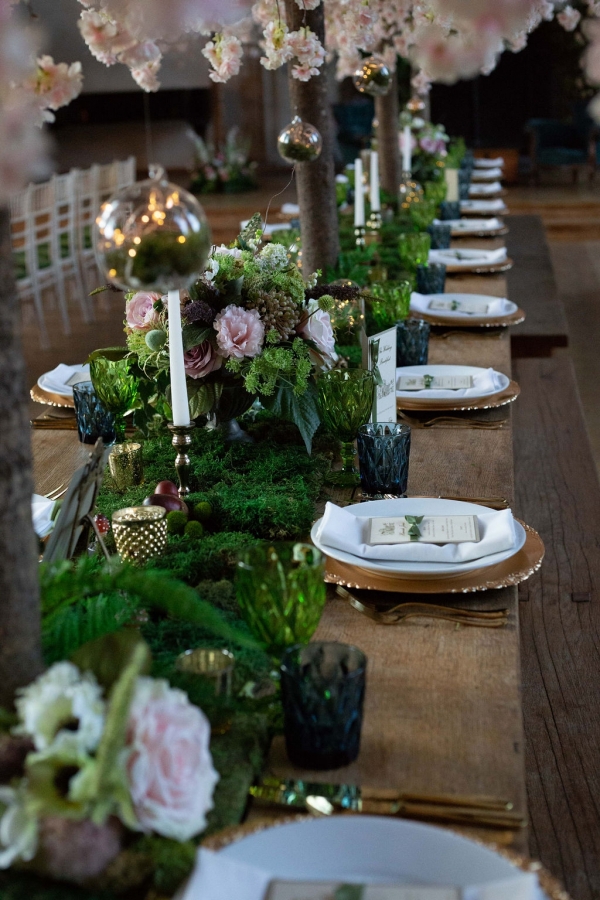 The magnificent feasting table was dressed with moss and pink blossom trees, with gold accessories around the tree bases to help show off the pale pink roses in the flower displays. 'Enchanted woodland' themed accessories added extra character and depth to the theme, creating a wonderful and interactive tablescape.