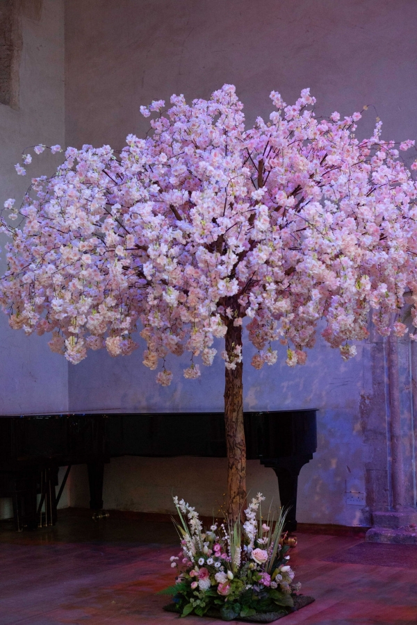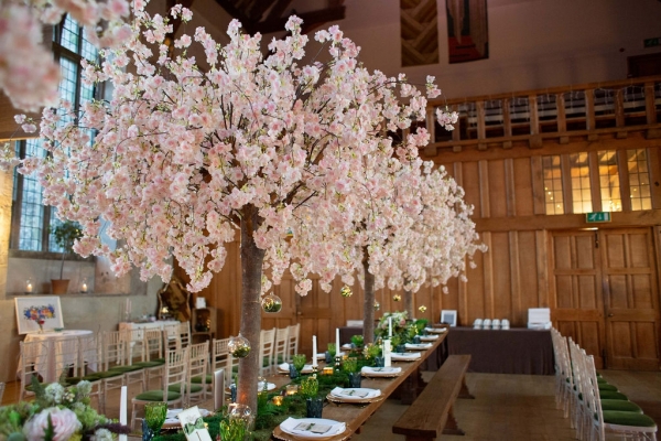 The venue worked closely with a team of stylists to create the chosen look. Unique Designs by Tina positioned large blossom trees on the stage in the hall alongside the Moongate Arch which had been positioned in front of the large fireplace. It looked stunning and made a very romantic backdrop for a wedding ceremony. The arch was styled with very soft pink roses to match the tree blossom.