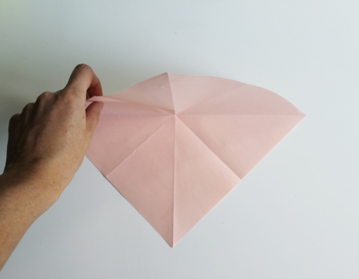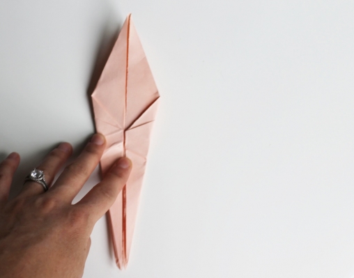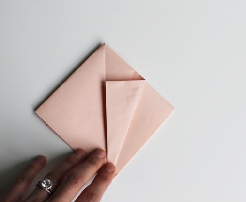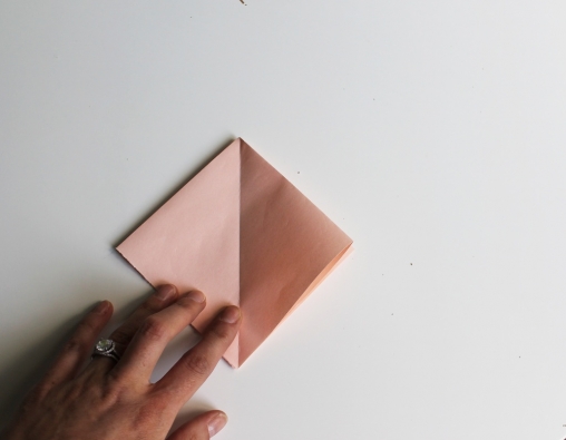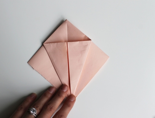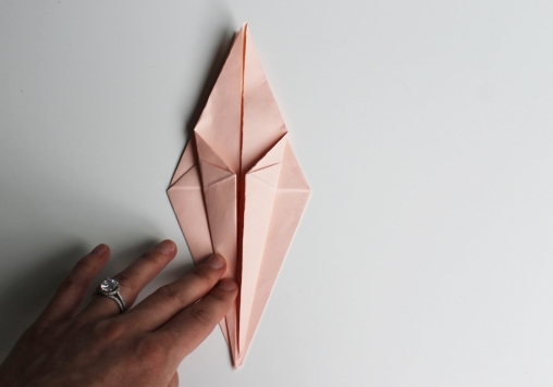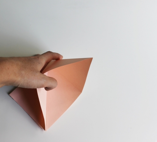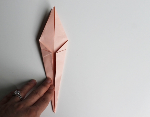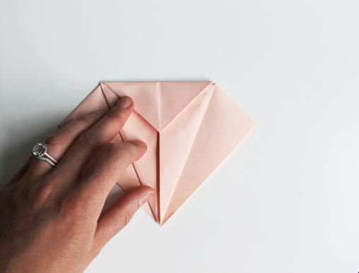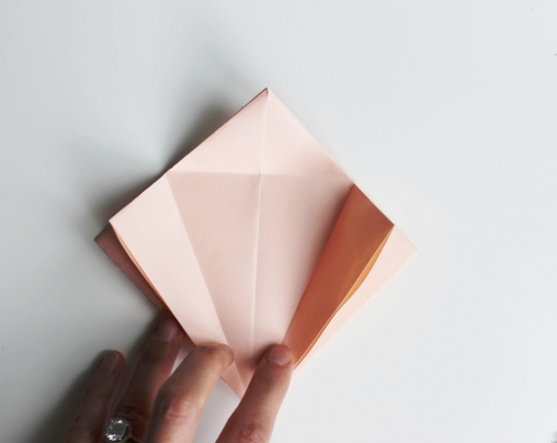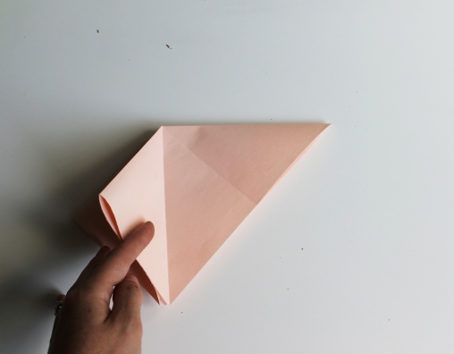 11. Take one layer of paper from your bottom point and begin to lift the paper, taking your bottom point towards the top point of the paper, making sure you fold the edges down.