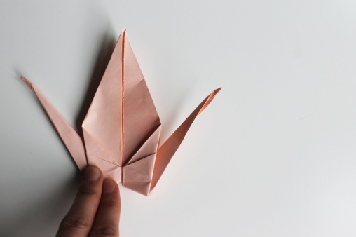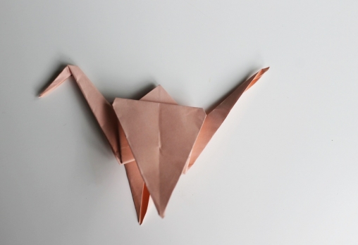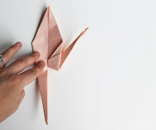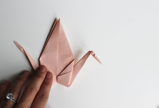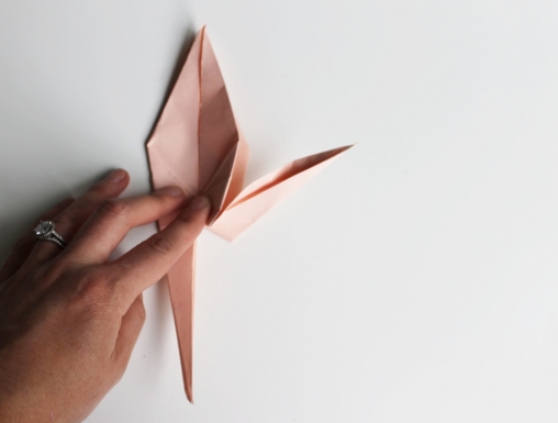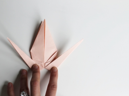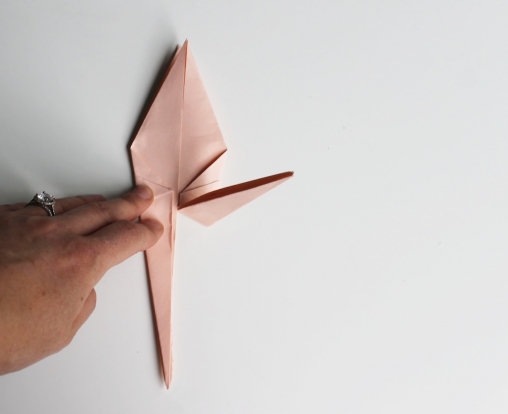 25. Then fold the wings down on either side of the crane. Your crane is now complete! Use wool thread and a large needle to thread through the centre of the crane and up through the centre point. Then tie a knot with extra wool under each crane to keep them in place.