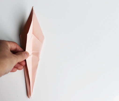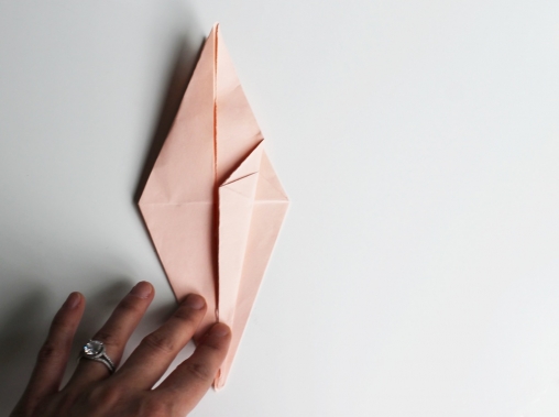 21. Then take the pointy leg at the bottom and fold it upwards and in on itself towards the folds you have just created.