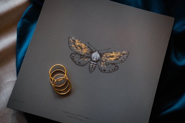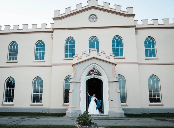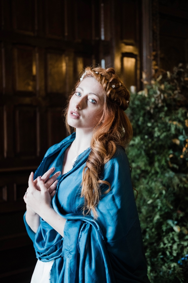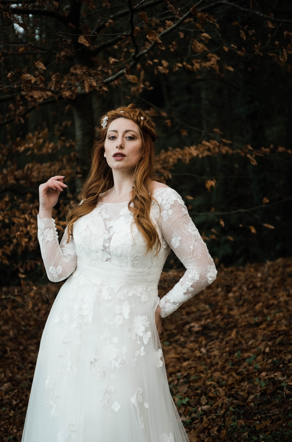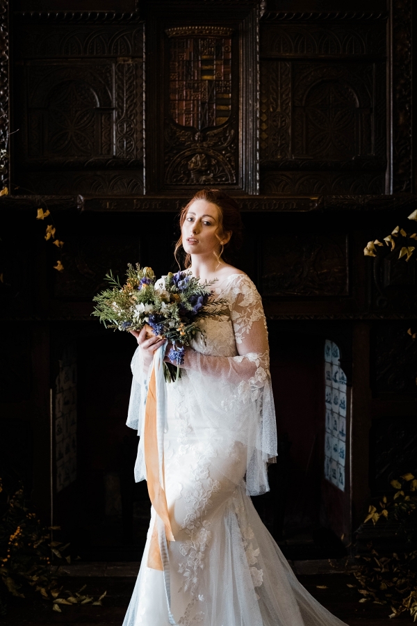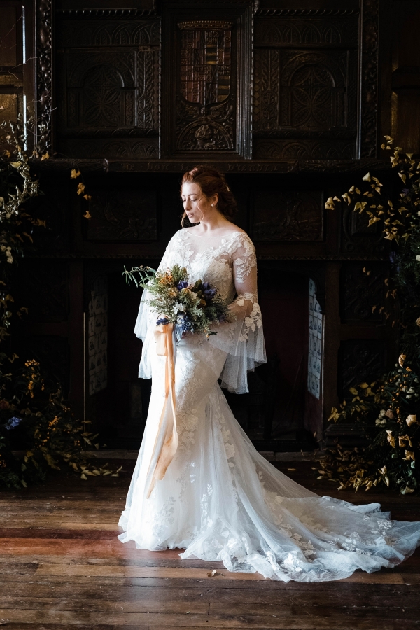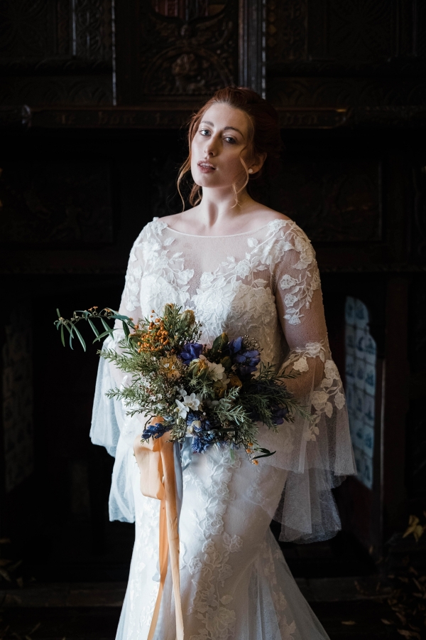 With drifting light across the floor capturing an atmospherically antique look with a romantic feel in these dramatic rooms, a step outside ups the ante with russet leaves capturing the shades of the bride's auburn hair perfectly. With fishtail braids and tumbling waves, her make-up of warm, soft shades enhances the silhouette of her gown flow with fine lace long sleeves. With Dutch artwork as the inspiration, it is the bride who is the muse; rich in colour, strong in her look, and elegant in her very own portrait of romance.