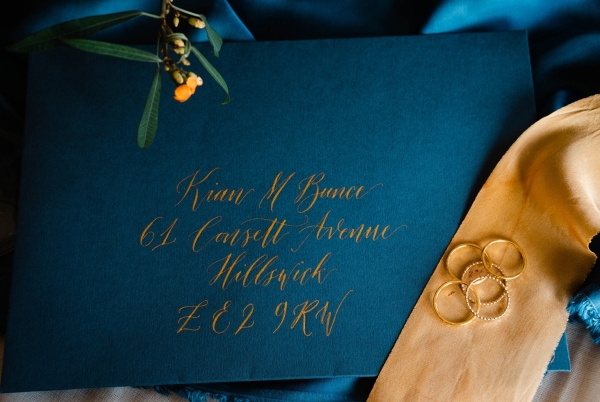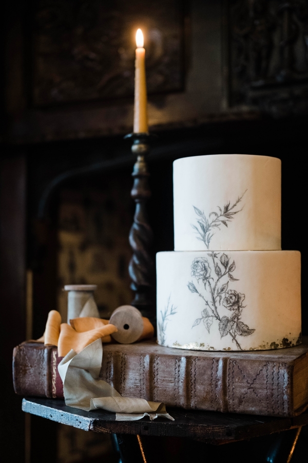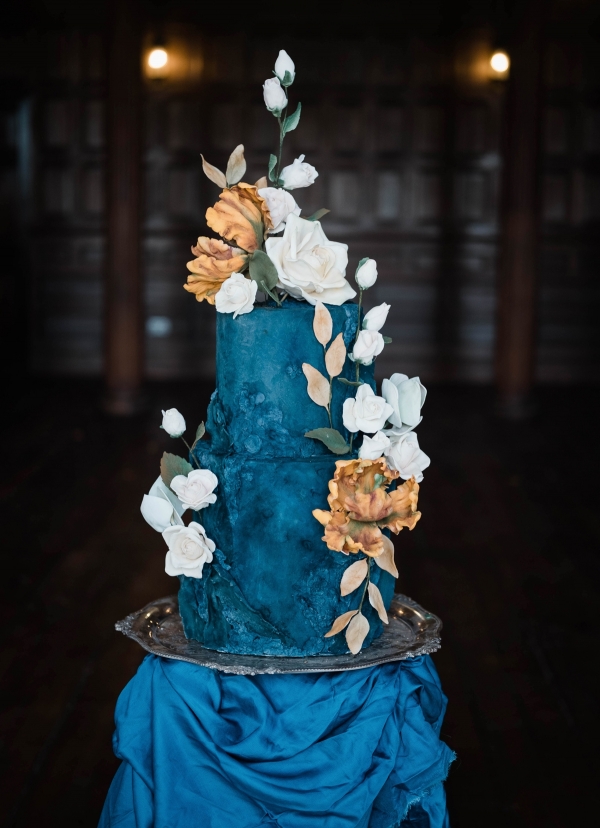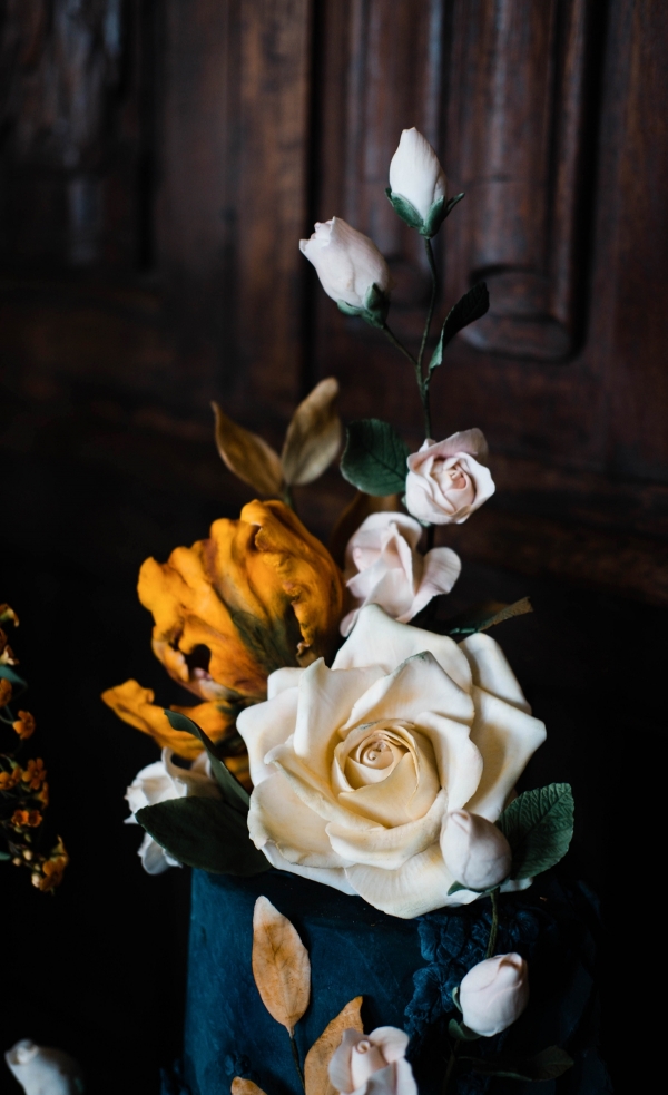 "These Dutch pictures use strong colours - deft blues, rich oranges, standout yellows and vivid reds. Even the springtime paintings aren't bright or flooded with light; instead mysterious and darkly lush," says Inky, describing how the hues influence the mood of the shoot. With a nod to the sugar brought in by Dutch merchant men, the indulgence of sugar work in the extravagant cakes showcase tulips and roses in those warm coral tones against the deep ocean blue icing with dragonflies flitting over its sky, a still life vivid against the wooden panelling.
