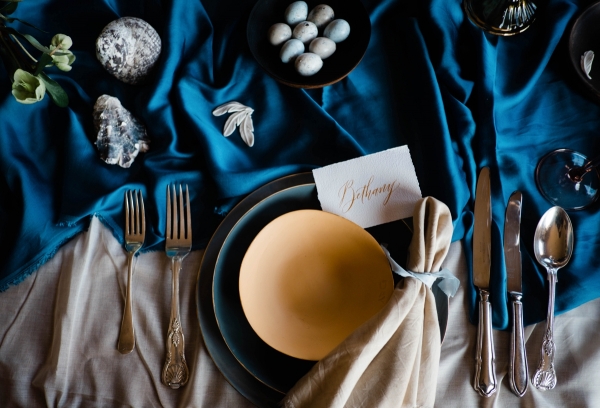 The tablescape showcases deep blue silks and rich corals in the runners, offset by buttermilk pale muslins, marbled fabric, coral bowls and plates thinly rimmed with gold.