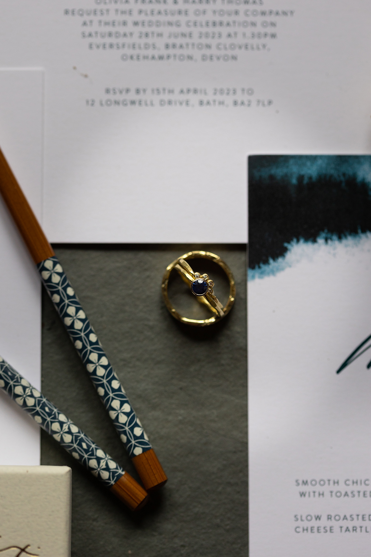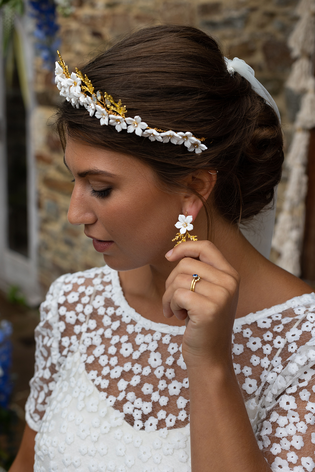 The finer details also nod to its intricate beauty, from the stationery gilded with gold leaf and wow-worthy blue sapphire engagement ring to the ceramic floral headpieces and earrings which crown the whimsical dresses, embellished with bohemian lace and dainty blooms.