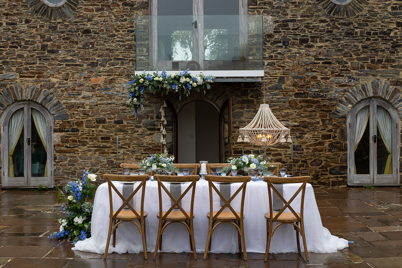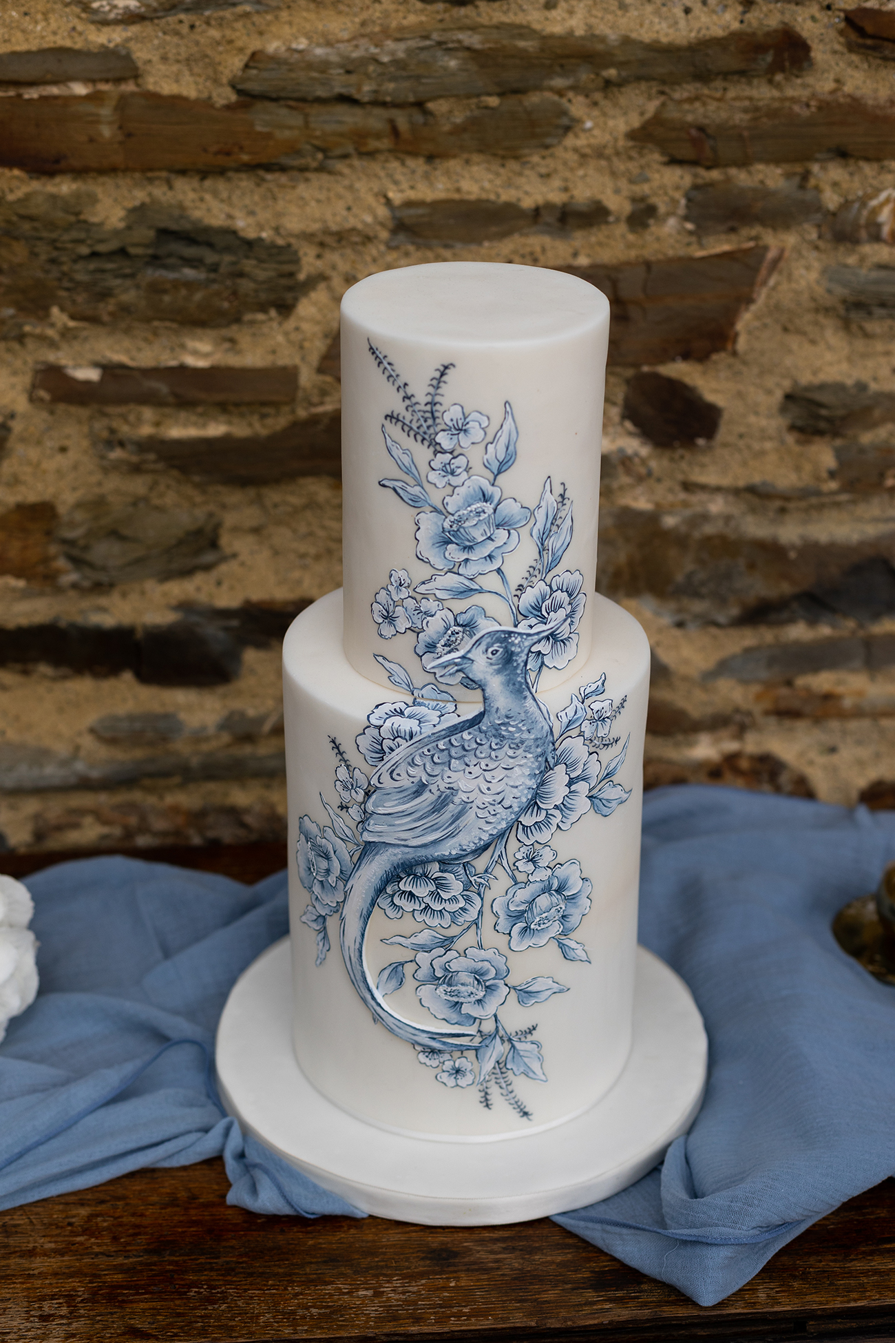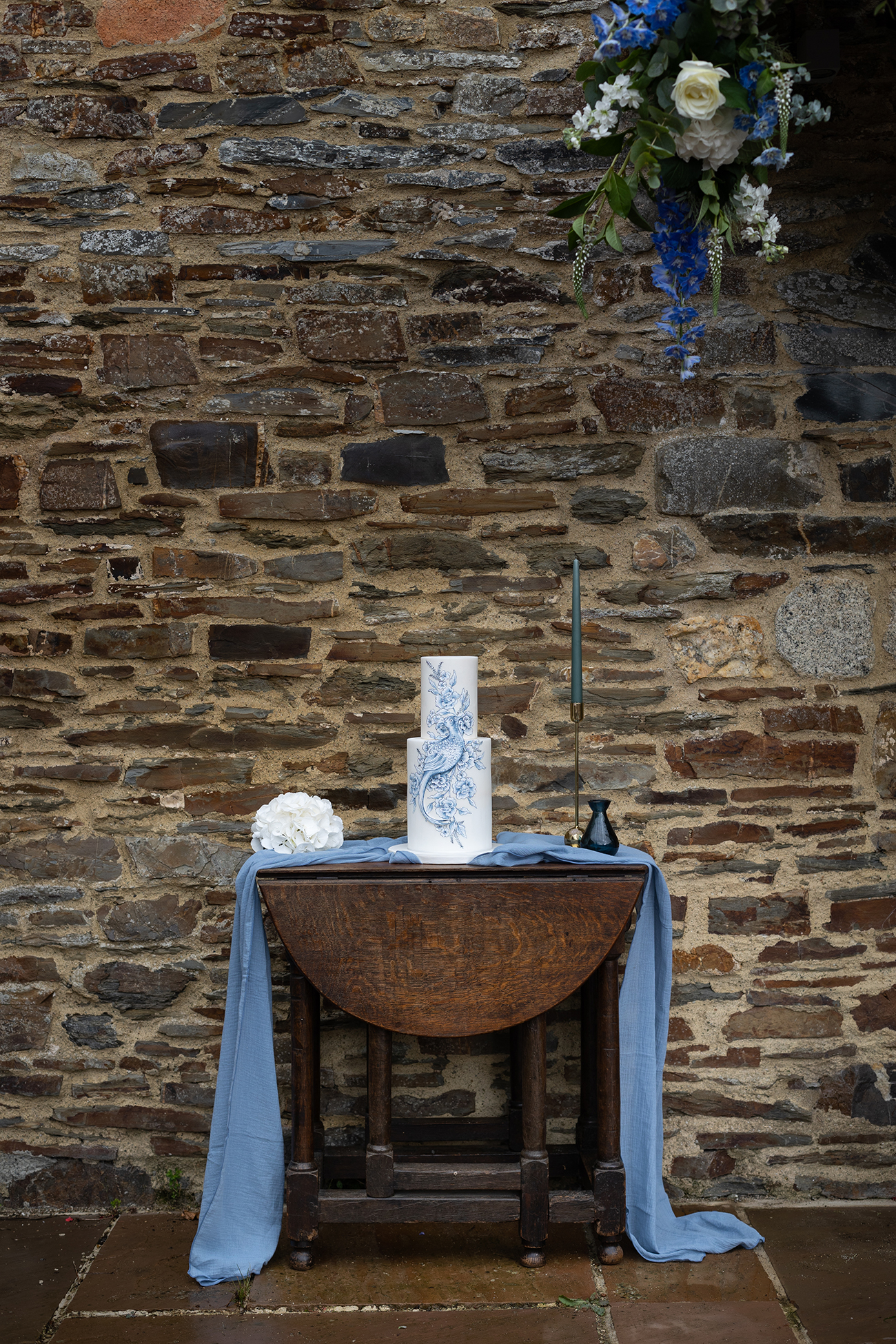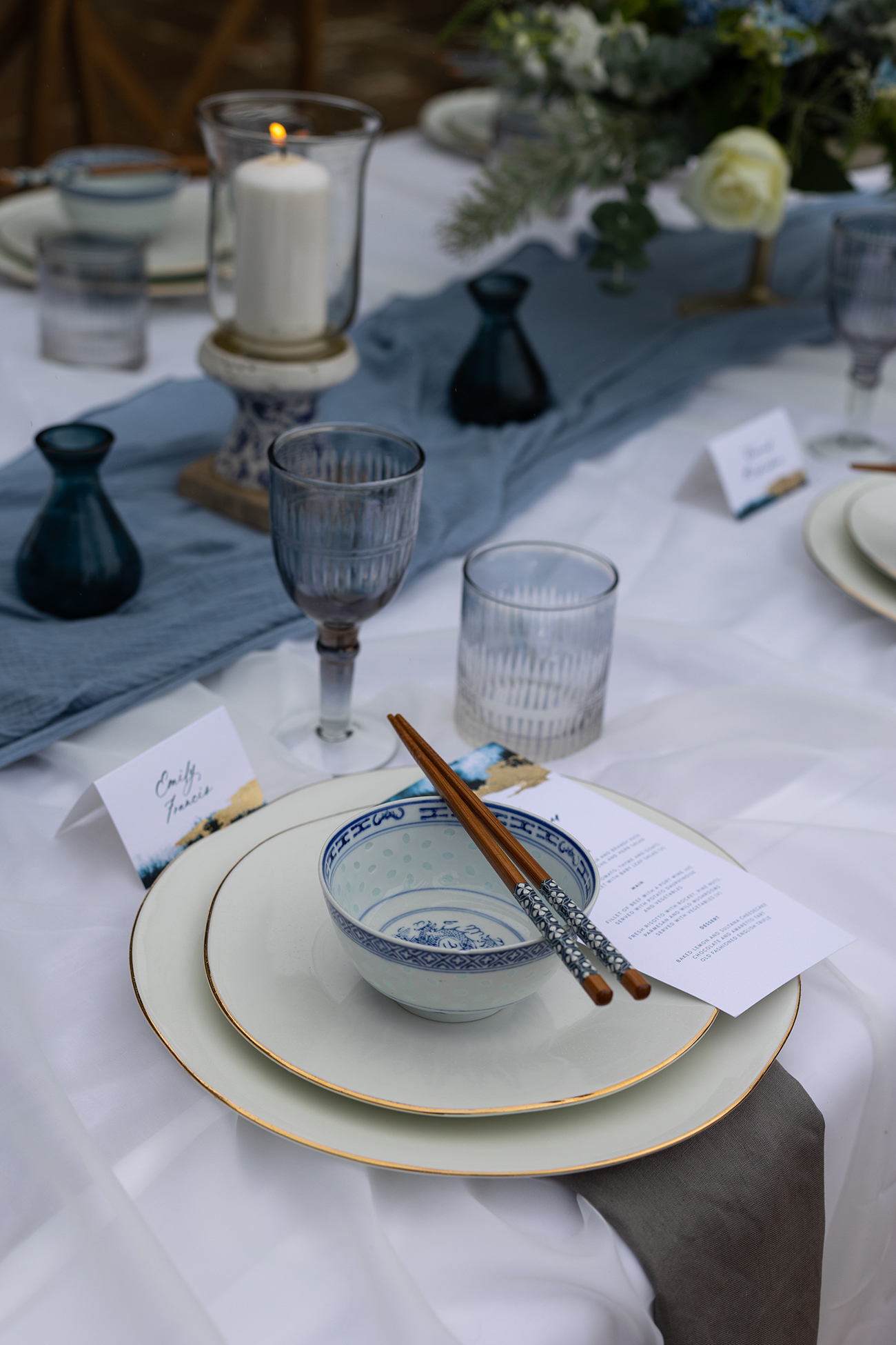 Set up in the charming courtyard flanked by converted stone barns, the minimalist tablescape carries the palette and delicate charm through tulle draping, smoky grey glassware and petrol blue vases topped with oak chopsticks and rice bowls layered over gold-rimmed porcelain plates. A handcrafted chandelier and hanging flower installation in shades of cream and blue frame the focal point of the intimate celebrations, while the exquisitely hand-painted bird and florals of the cake beautifully echo the fine design of the bowl.