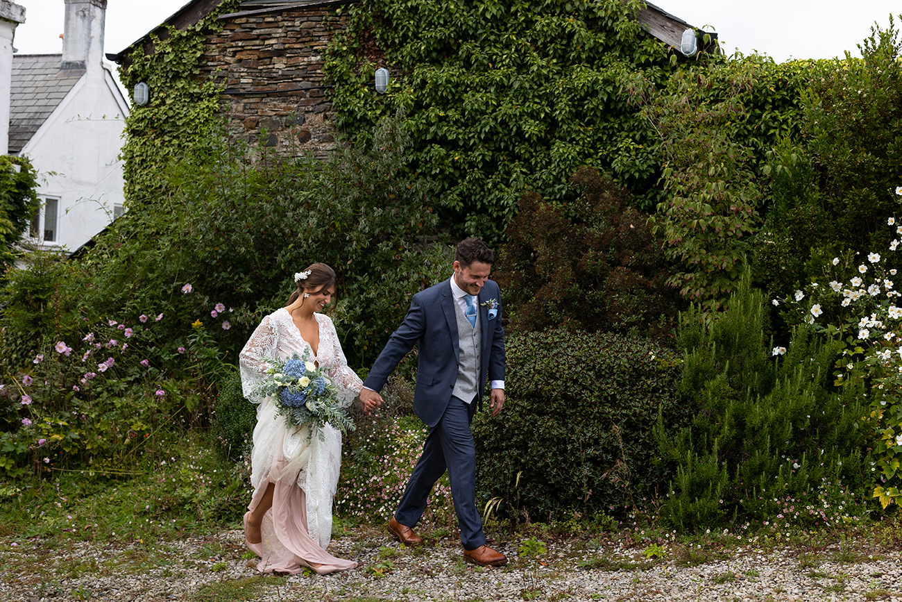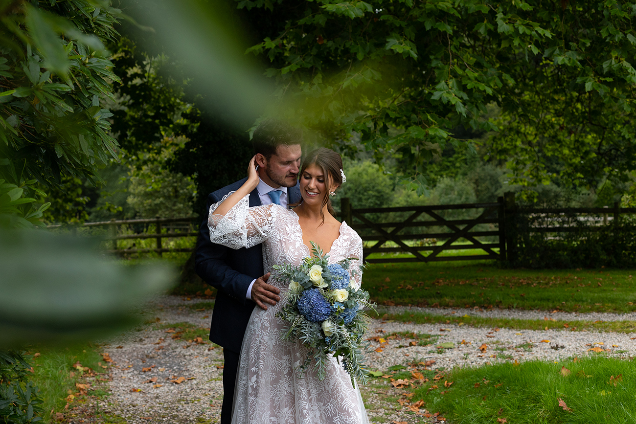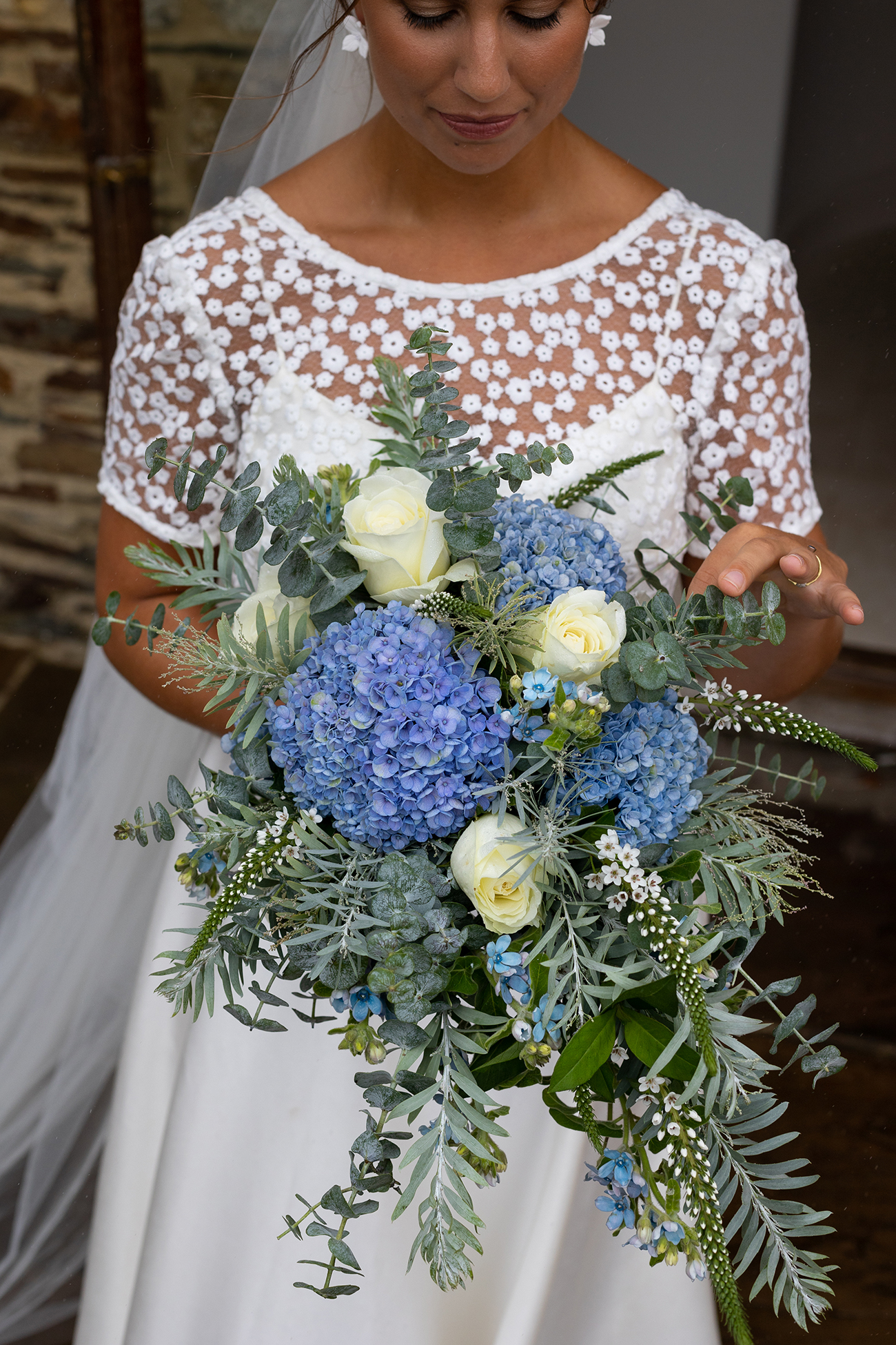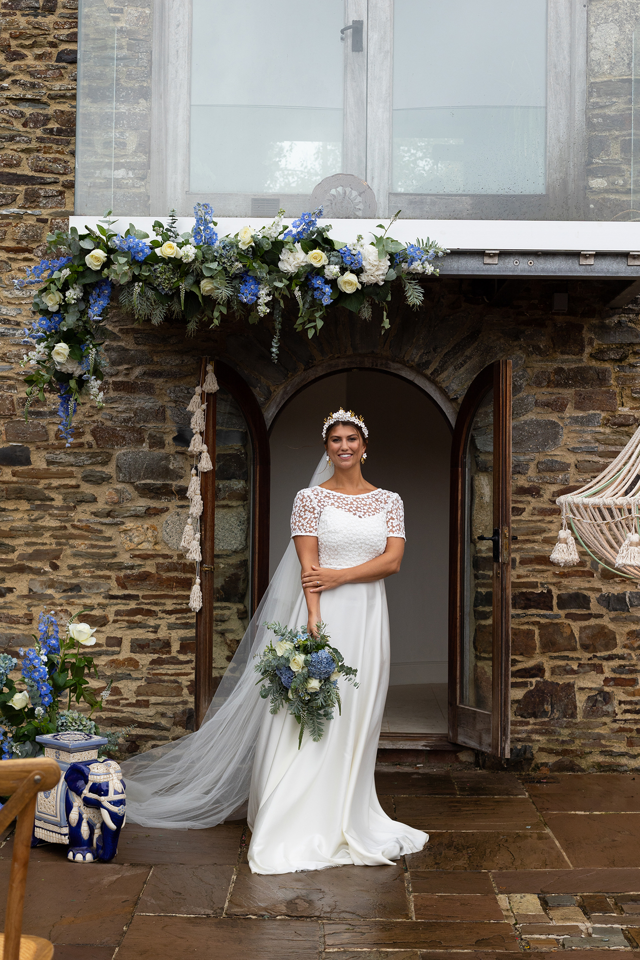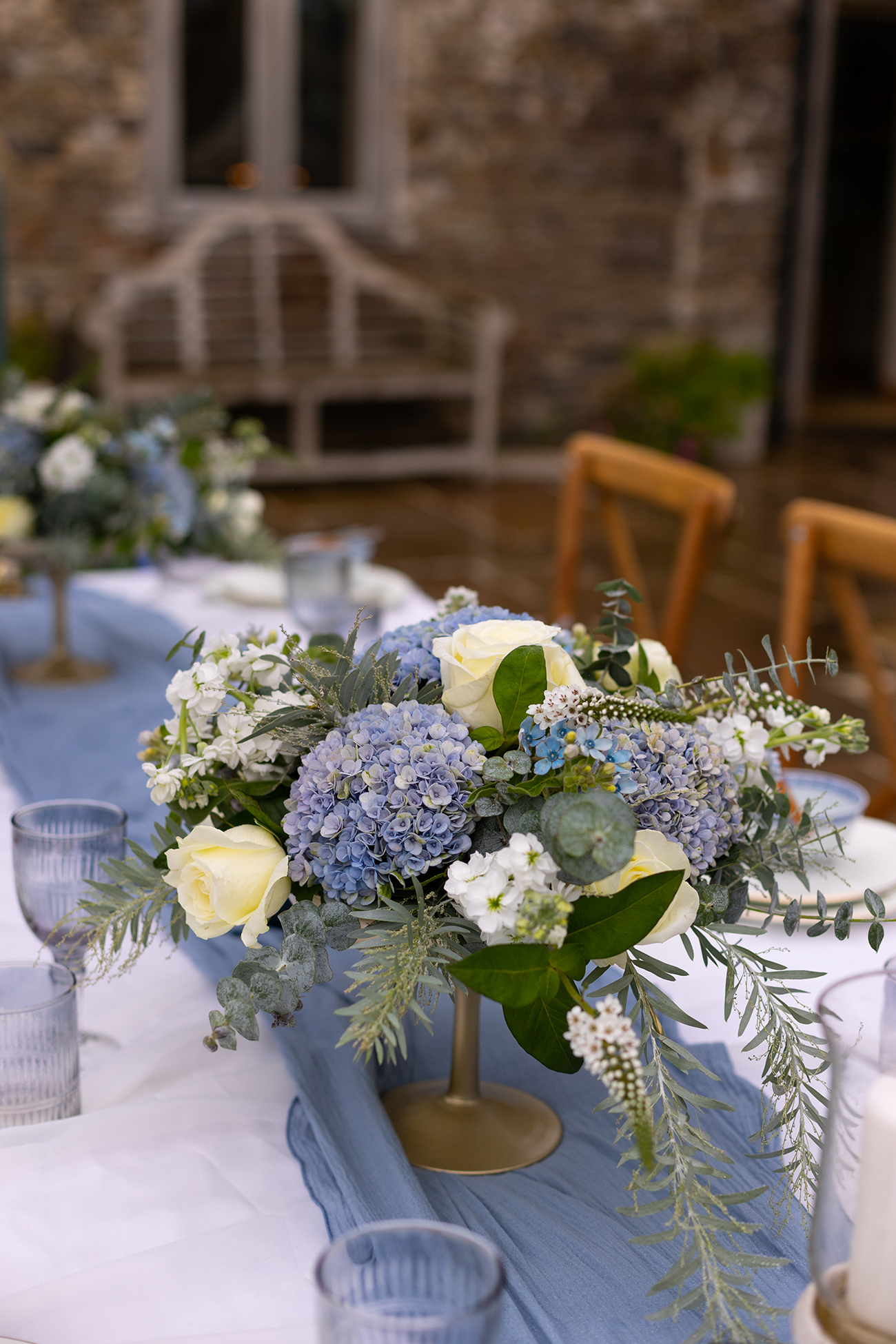 Set up in the charming courtyard flanked by converted stone barns, the minimalist tablescape carries the palette and delicate charm through tulle draping, smoky grey glassware and petrol blue vases topped with oak chopsticks and rice bowls layered over gold-rimmed porcelain plates. A handcrafted chandelier and hanging flower installation in shades of cream and blue frame the focal point of the intimate celebrations, while the exquisitely hand-painted bird and florals of the cake beautifully echo the fine design of the bowl.