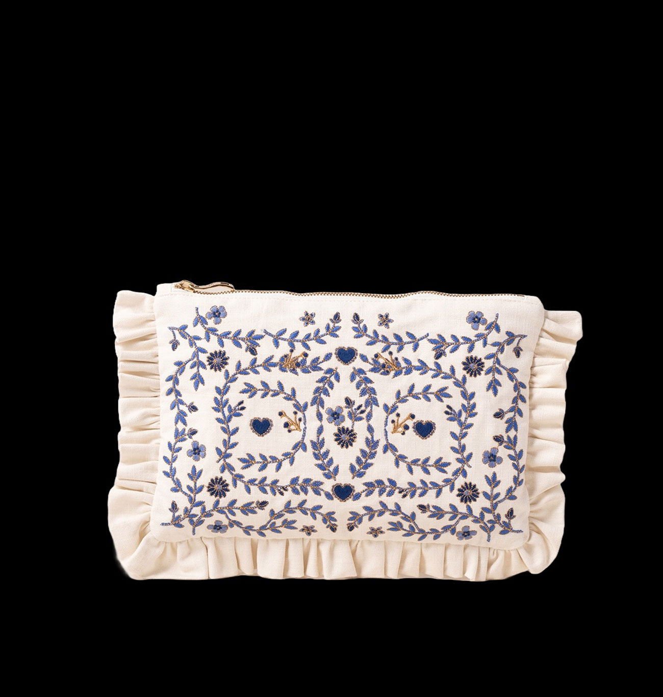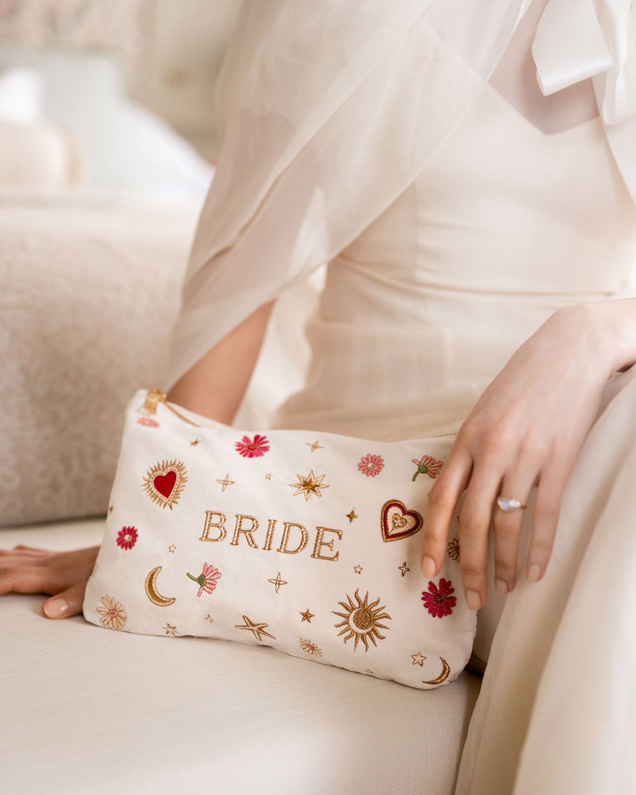 Keep your wedding-day essentials close with an embroidered pouch from Elizabeth Scarlett. The latest collection spans awash with beautifully boho celestial motifs, delicate florals and nature-inspired designs, each finished with intricate detailing. They also make a covetable gift for bridesmaids, with many styles offering personalisation through custom initials for an added personal touch.