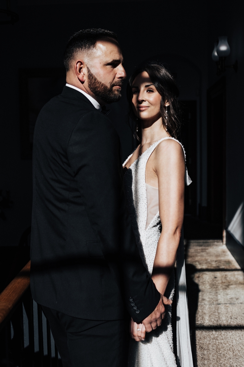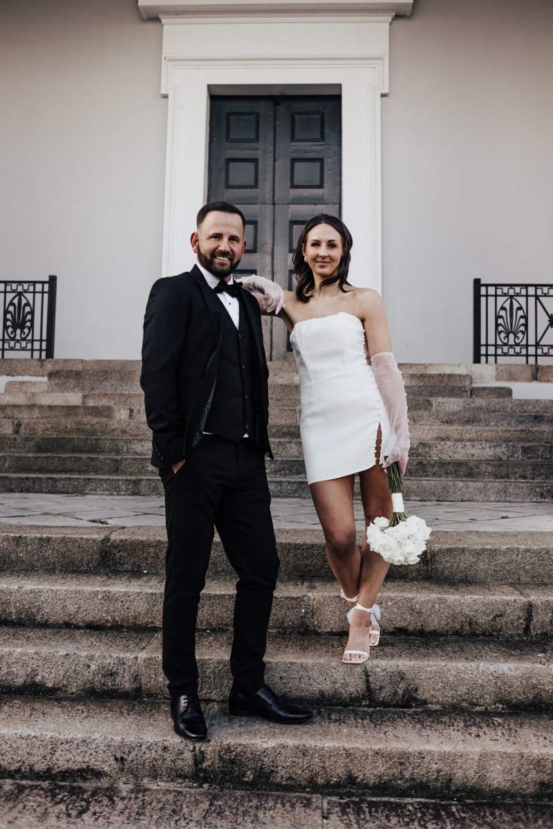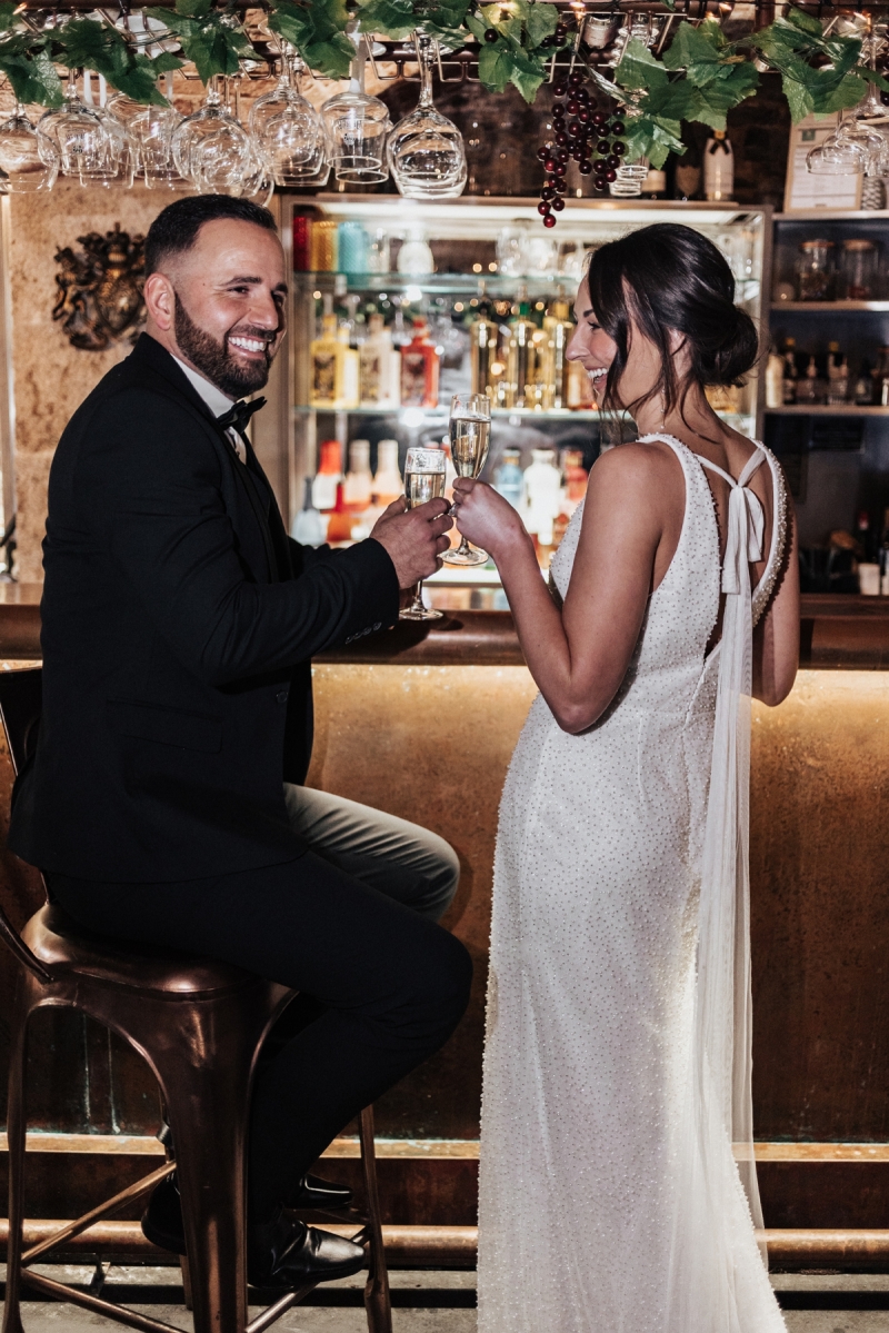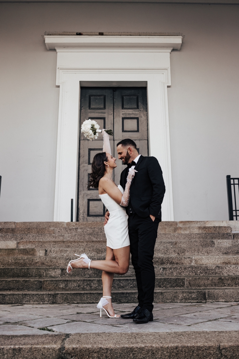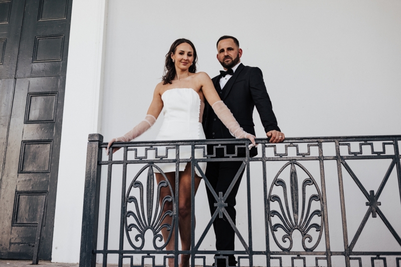 One of the most jaw-dropping features of the editorial is the Vera Wang Bride wedding gown, a stunning vintage-inspired number in nude-beige tulle complete with all-over beading, plunging neckline and fabulous floor-length tail accent. Built for dancing courtesy of a plisse insert on the skirt, the bride epitomises modern glamour with a dreamy high fashion edge. Flanked by a groom in on-trend black tie, the effect of each ensemble is unadulterated elegance, which is emphasised by each uber chic setting - from open doorways adorned by hanging floral installations to the crumbling exterior of the old mill building on Millbay Road (where the bride has swapped her sweeping gown for a fun Little White Dress).