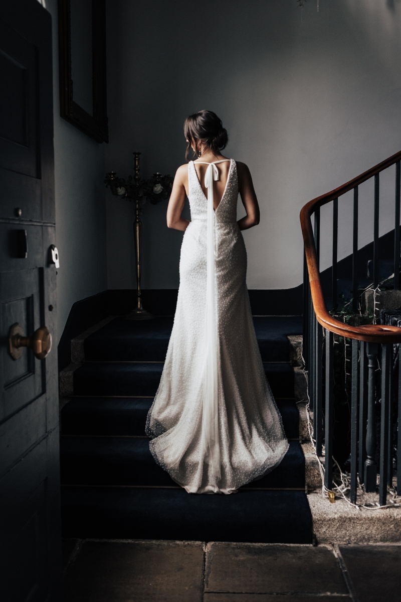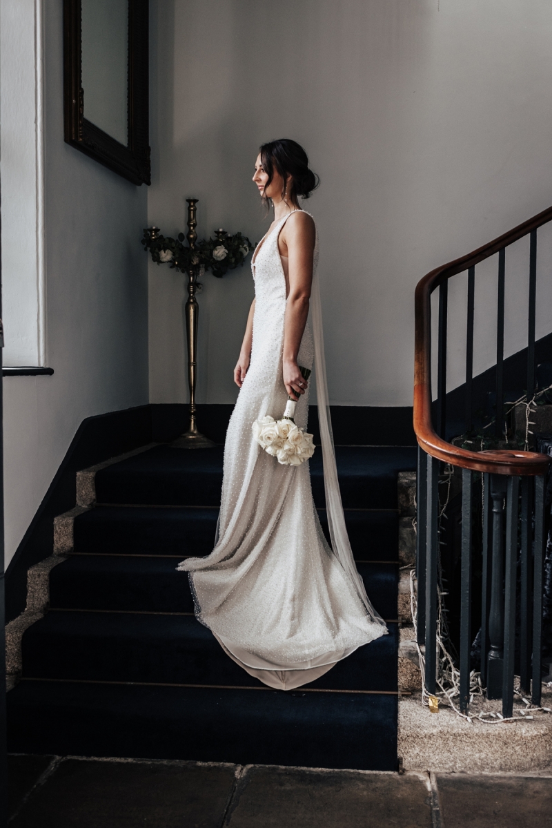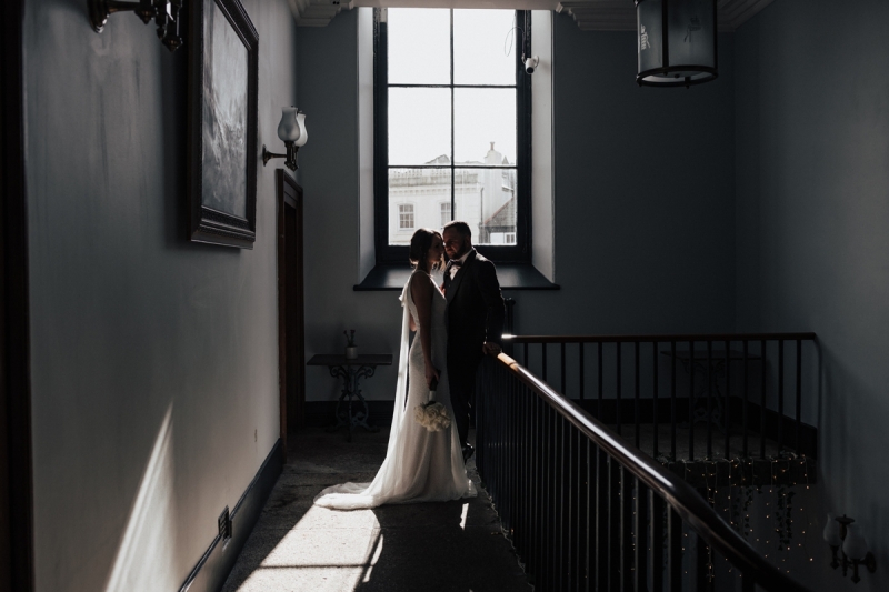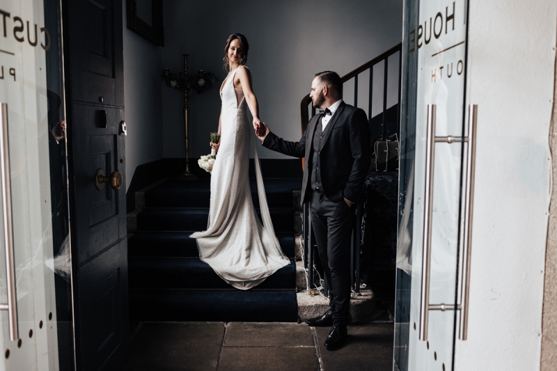 The Custom House was the venue for the majority of the shoot, where the couple enjoyed exploring a range of rooms and backdrops at this most architecturally pleasing place. From pre-ceremony drinks in the boudoir to uttering their vows by the spectacular fireplace beneath a showstopping chandelier in the Long Room, the series of statement features add a dose of high drama and layers of interest to what was otherwise a beautifully simple and pared-back shoot.