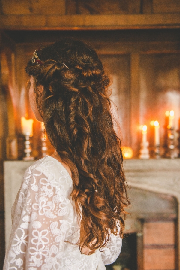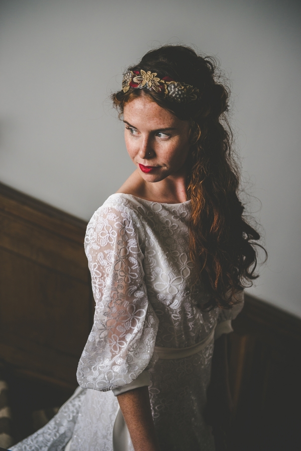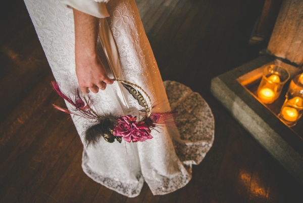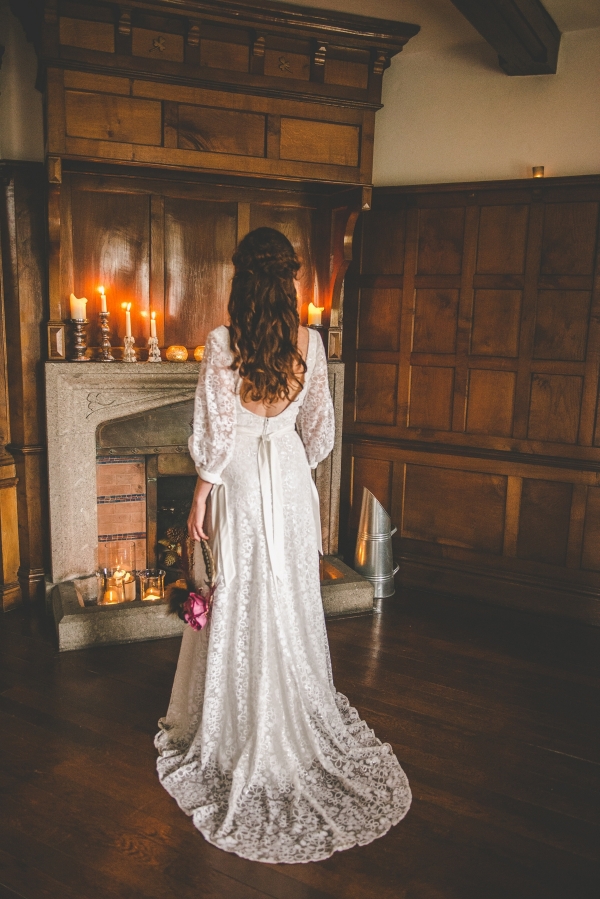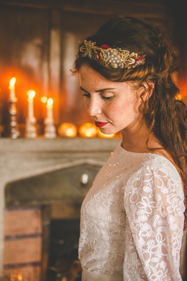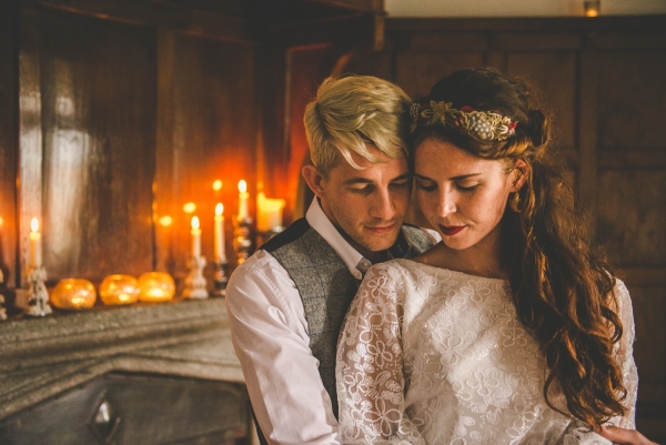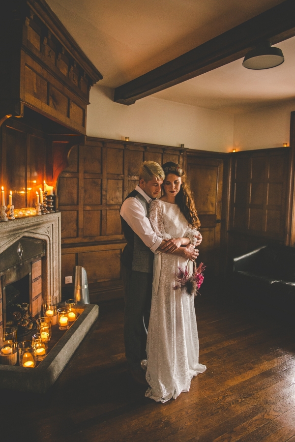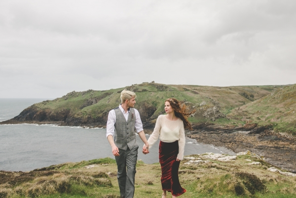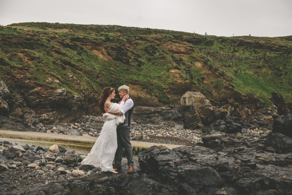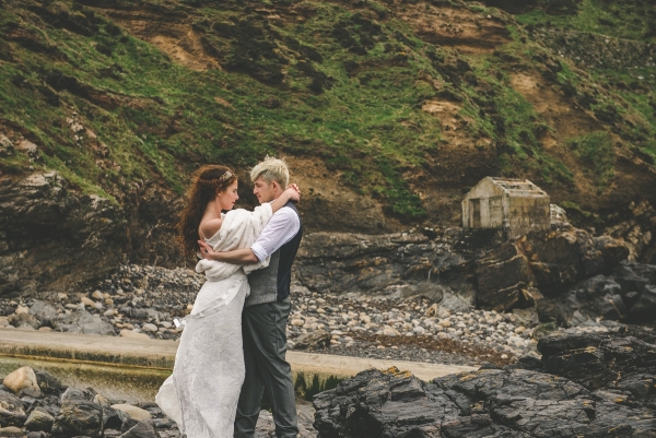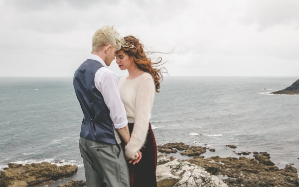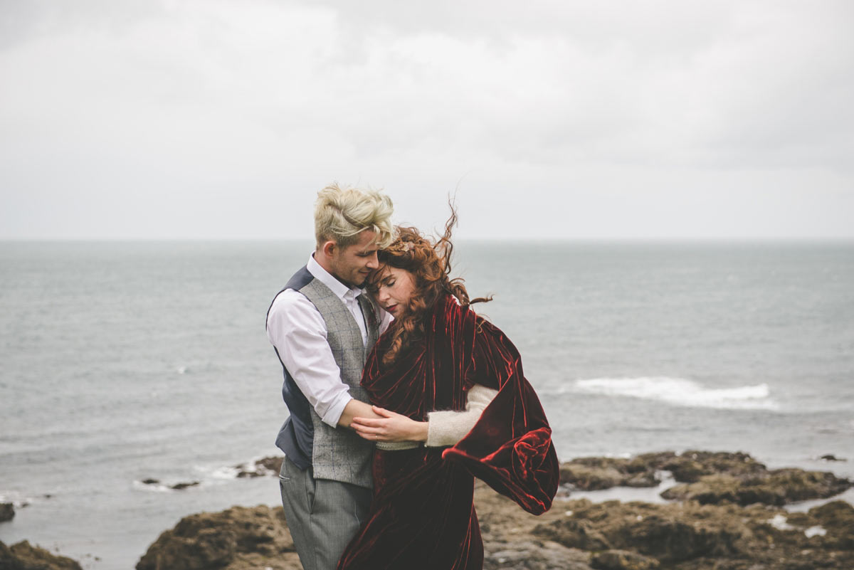 Elopement venue BoHo Cornwall serves as the backdrop. The rich hues, tumbling red curls and warm glow of candlelight contrast beautifully with the grey and desolate landscape, as do the gowns, ranging from snug textured separates to a delicately beaded design. Witnessed only by the soaring gulls and crashing waves, the pair look into each other's eyes and are intertwined forever as husband and wife.