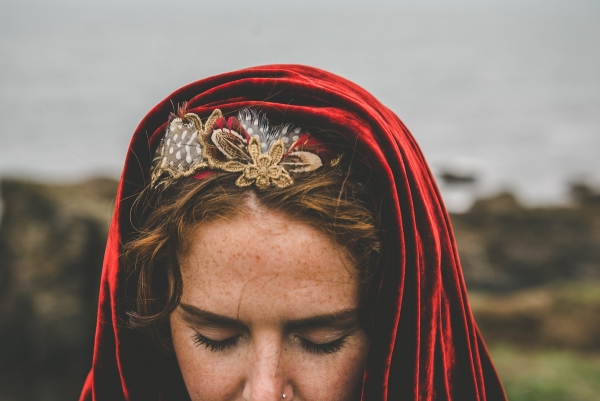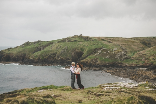 "I curated and shot this styled shoot based around the concept of a couple running away to the wild west of England to elope," says photographer Suzanne Johnson. "Colour themes of sumptuous crimson and gold with lush velvet textures are set against the rugged Cornish coastline."