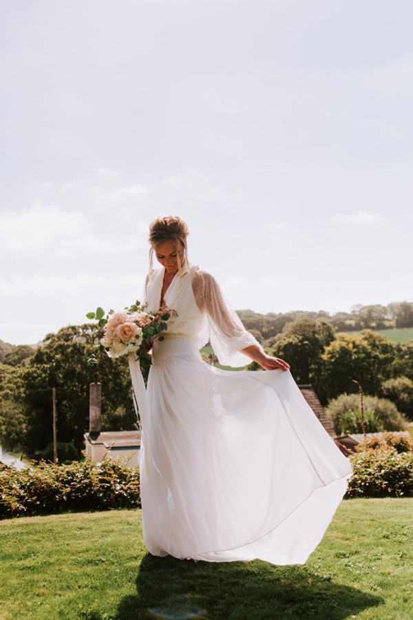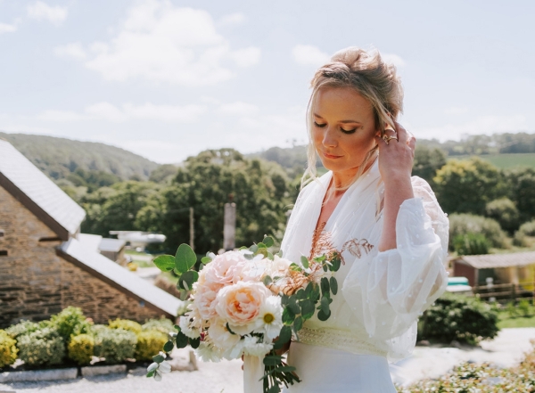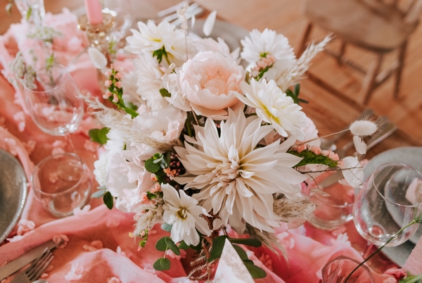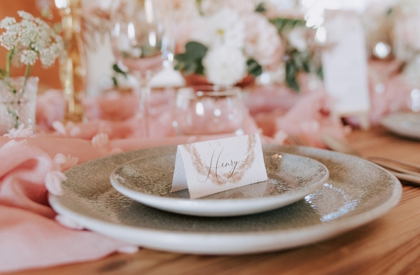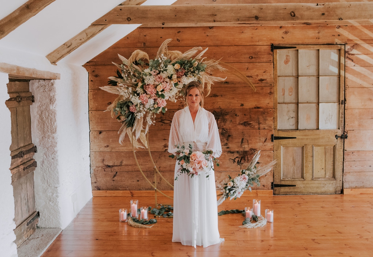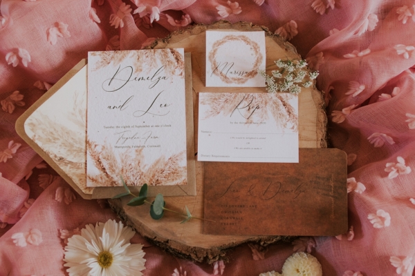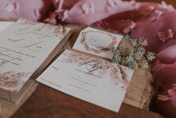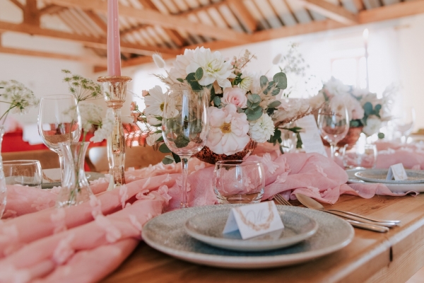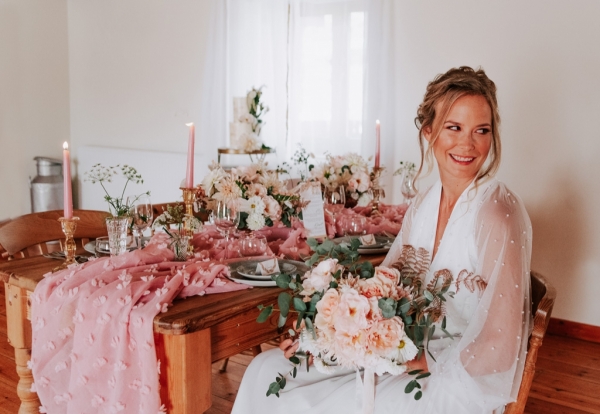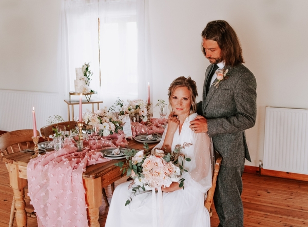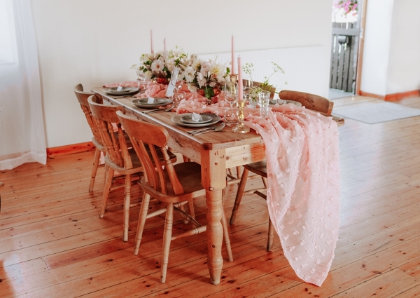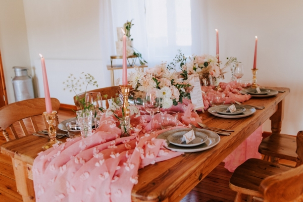 Choosing a palette of pretty pinks and peaches for the table for two at Tregedna Barn, the coordinated efforts of a team of local suppliers demonstrates how to achieve something special with the smallest of spaces and most miniscule of guest lists.