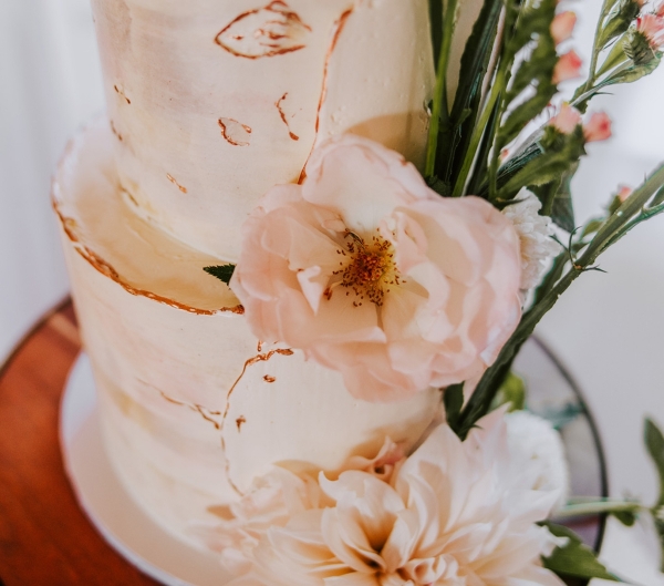 Statement features such as the gorgeous floral moon arch - replicated in the beautiful bridal bouquet - and semi-naked cake complete with fresh flowers lends eye-catching interest to the scene, which is made even more resplendent with a scattering of candles and metallic accents.