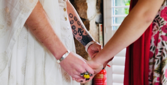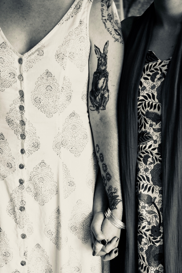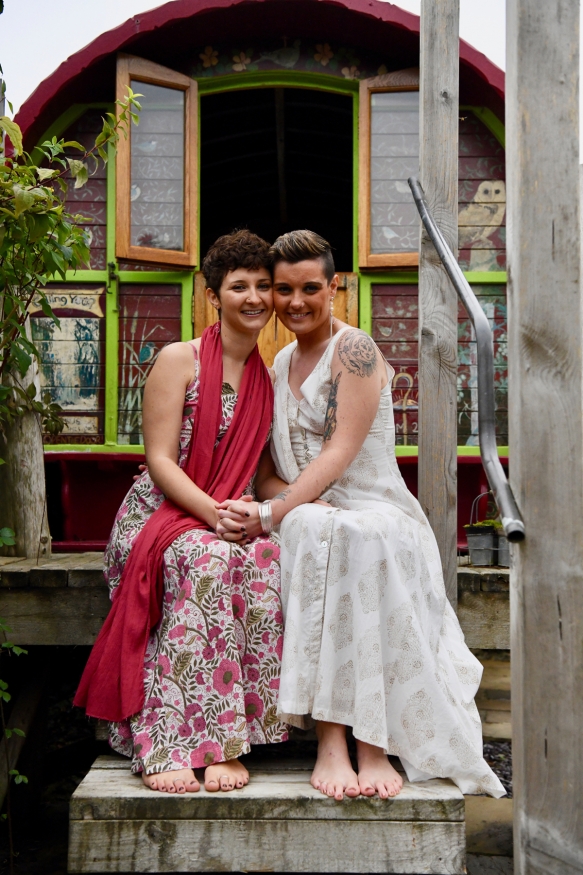 On the day, we took our time getting ready together. We had a lovely vegan full English breakfast, drank coffee and laughed! Our dresses were handmade in India - a special place for us and our time there really made the foundation of our relationship what it is today. We wanted to reflect the simplicity and the beauty of India in our clothing.
