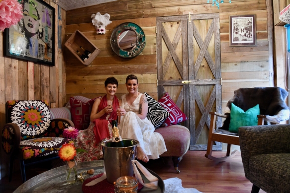 The actual ceremony was really quick, but it was beautiful. Sliding the ring on each other's fingers and holding it there for a moment while we acknowledged that this officially means we are team was a real standout moment. It was a wonderful moment to acknowledge that 'this is my person'. It was drizzling lightly and as our bare feet touched the cold concrete while we walked towards the Wed Shed, we felt completely present in where we were and what this meant to us.