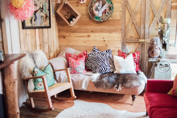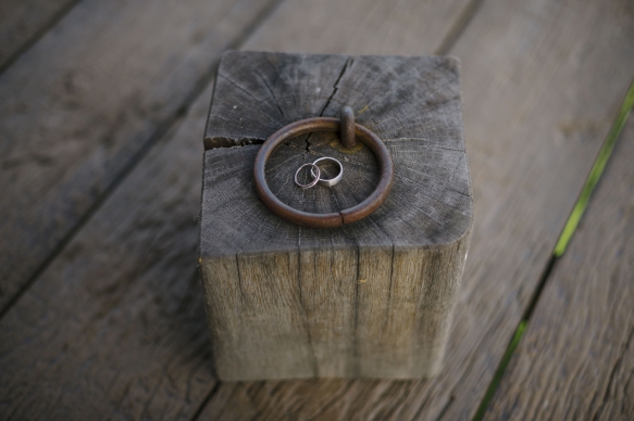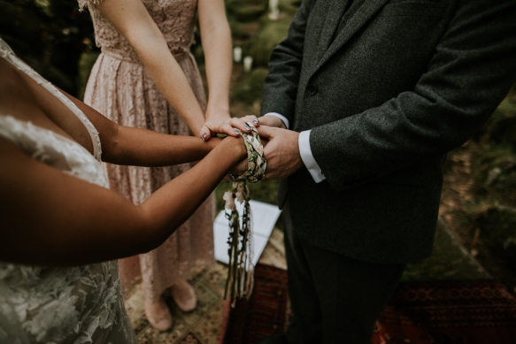 We proceeded with our ceremony, which included readings, our own vows, exchanging of our rings and a handfasting ceremony, then had the pleasant surprise of a pack of foxhounds running through the woods just above us. Props-wise, we kept it simple with two vintage rugs and a small white wooden chandelier.