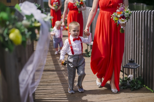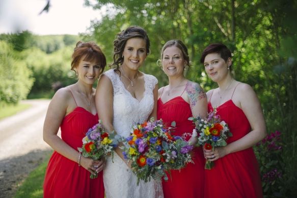 We woke up to the sun shining and enjoyed a relaxed breakfast outside, taking in the beautiful views. The hair and make-up artists came in the morning to get my three bridesmaids and I looking fab, then the florist dropped off the beautiful bouquets - they were an incredible team, decorating The Nest for the ceremony and then transforming it for fine dining afterwards. We opted for a vibrant colour scheme: red for the bridesmaids' dresses and groom's party accessories and sunny yellows, oranges and pinks for the flowers.