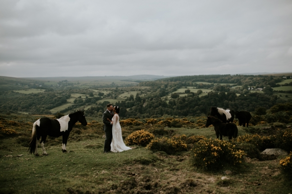 Then came the first look. I walked down a driveway under a canopy of trees where Eric waited with his back towards me. He turned around to see me dressed to be his wife. It brought tears to his eyes. I was smiling so much my cheeks were hurting. We then headed to Dartmoor, making photo stops along the way - one of our favourites being with the wild Dartmoor ponies. The scenery was amazing and the ponies were so close to us, it was such a fairytale scene.