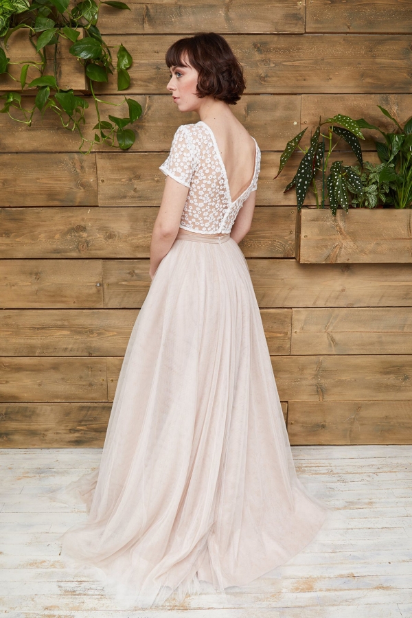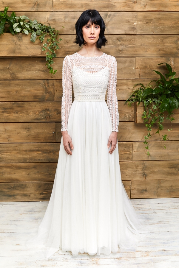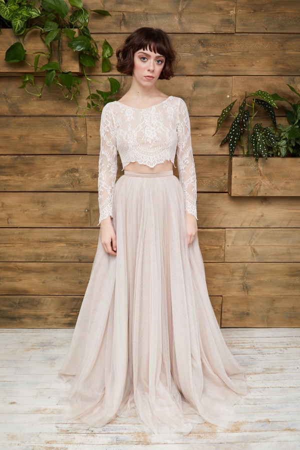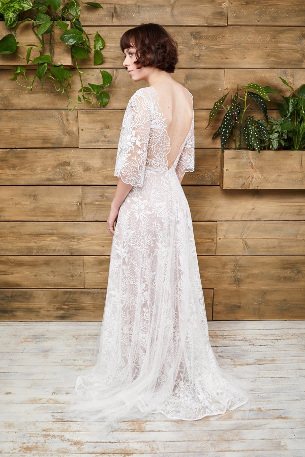 One of the collection's statement pieces is Orion, a nude tulle covered in glitter moons, stars and unicorns with straps that can come in a range of colours and a full circle skirt with low back. Or there's Indie, where exquisite embroidered lace with nude tulle underlay combines with loose sleeves and fitted embroidered bodice with deep plunge, small front opening and low V back with the label's signature cut skirt.