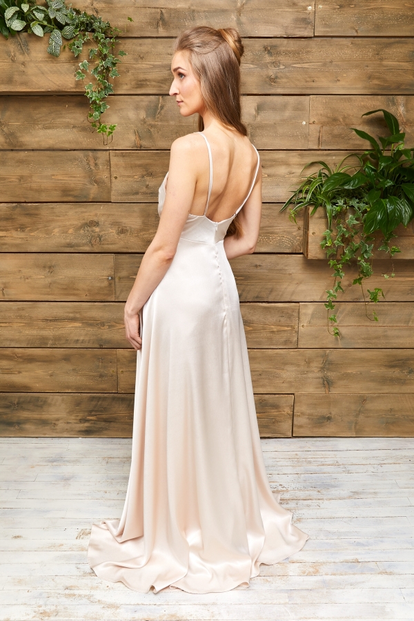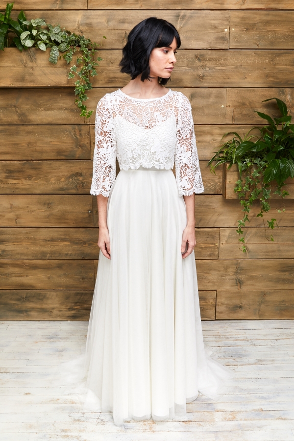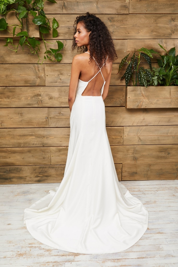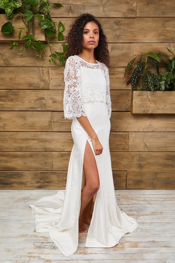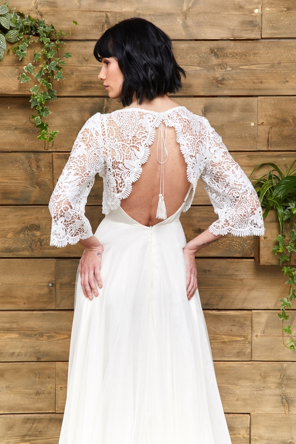 For a more pared-back look that's all about the cut, Winslow is a reimagined slip dress featuring a square cut top, cross over back straps, full open back and fitted skirt with slit; or for a touch of 70's vintage romance, Greta is a gorgeous guipure lace gown with fitted skirt and sleeves, with the addition of tulle godets from the knee that give it a kick flare and hidden movement.