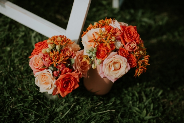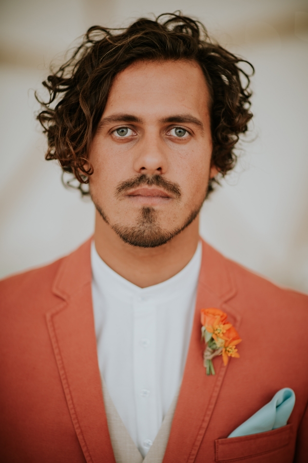 The looks of the bride and groom carry the gorgeous aesthetic of clean lines, pops of colour and laidback vibes. The groom makes a coolly contemporary statement in a vibrant tangerine jacket teamed with neutral shades, while the bride wears layered vintage gowns - "to create a delicate silhouette and individuality" - a sleek pony tail and warm make-up with a delicate touch of ginger colour. "The look was completed with silver henna tattoos on the hands and wrist to bring the overall theme together perfectly," says Bridget.