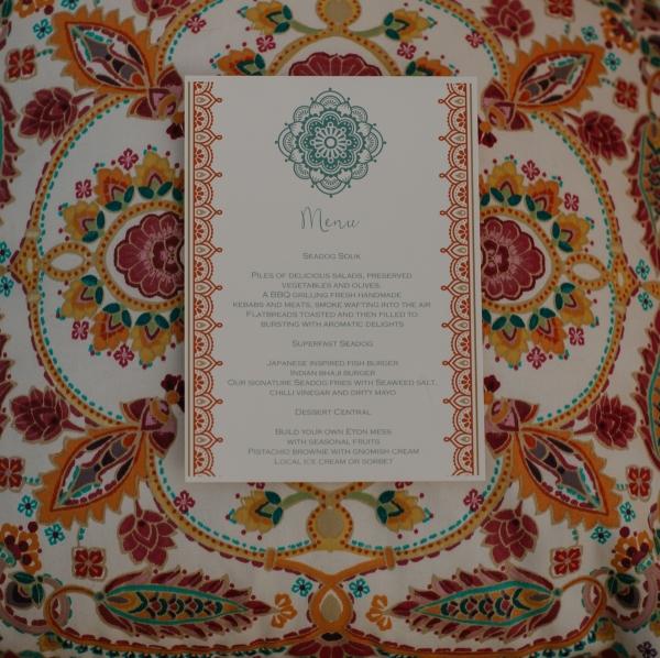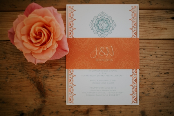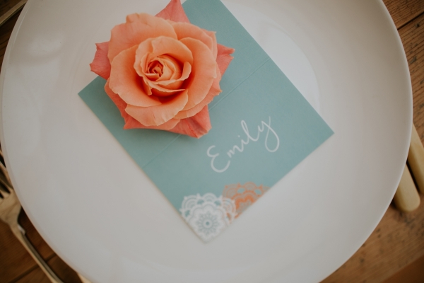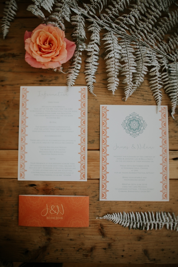 "I was inspired to use a punchy ginger and mint colour scheme based on current trends and a twist on an Indian summer vibe," explains stylist, Bridget Scott of Blue Fizz Events. Henna patterns were key to the aesthetic and carried through the eye-catching stationery and intricately embellished cakes, while mirroring the warm palette.