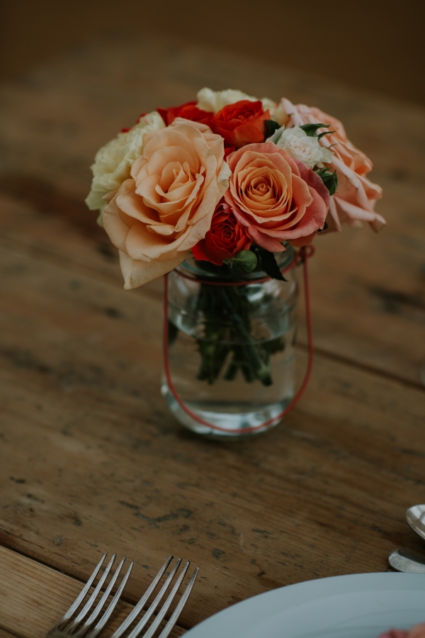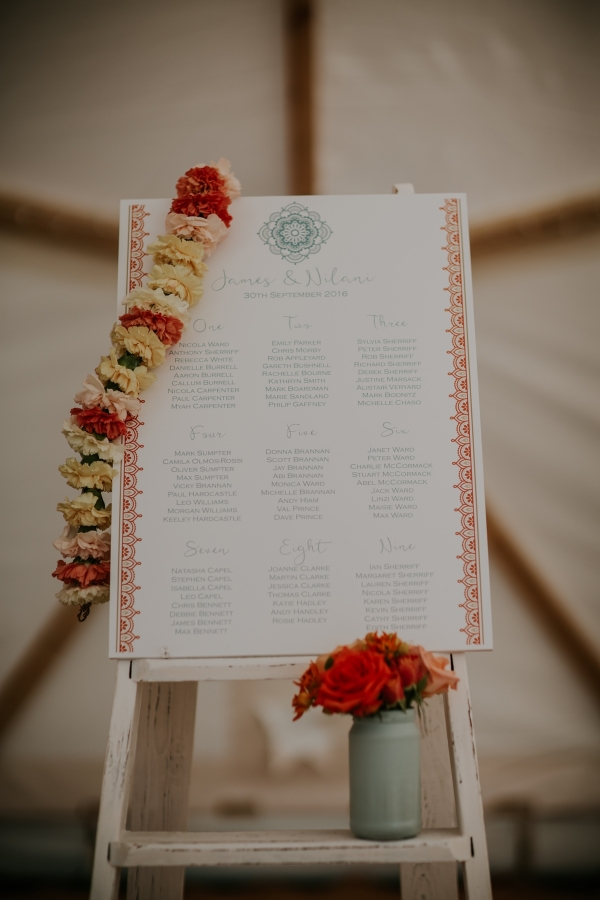 "I fell in love with Indian flower garlands and wanted these to tie in with the ginger colours, with complimentary flower arrangements for the wooden tables," says Bridget. "I opted for a flower garland in a traditional style rather than a bouquet to continue the relaxed, unfussy vibe." The table styling echoed this simplicity. "I used upcycled jars with enamel paint to hold the flowers, silver ferns and simple lanterns."