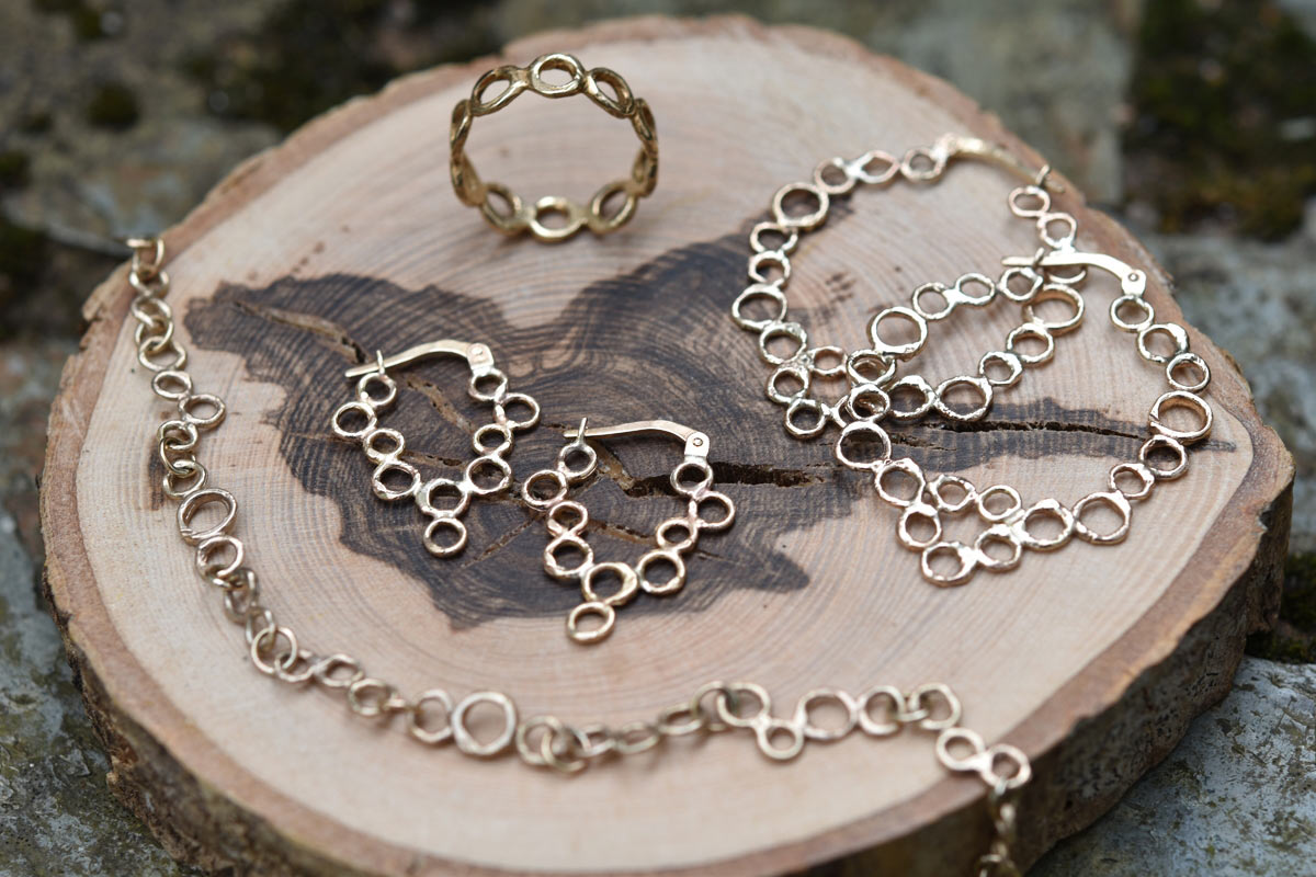 Devon-based jewellery designer-maker Erin Cox continues to push the envelope with her exquisite creations. Her latest creations feature molten bubbles, using them to craft balls and settings for stones to ensure an uber-elegant finish to her striking collection. The organic look and feel of Erin’s work lends a unique allure and unmistakeable edge for jewellery with a palpable feel-me quality. From her tactile bubble ball necklace and diamond set trio of bubbles ring to her molten link bracelet, yellow gold chandelier bubble earrings and statement bubble circle necklace with a trio of diamonds, however you wish to wear Erin’s designs, you’re guaranteed the most showstopping results.