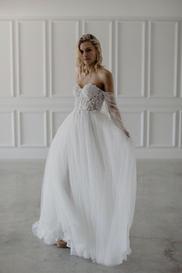 Opt for a regal take on the trend with long sleeves, lashings of lace and satin, or choose something more boho with floral accents such as appliques, embroidery and 3D florals. Whether you wish to indulge your whimsies with illusion panels, dotted tulle skirts and pretty details, or channel a more timeless look courtesy of an exquisitely cut gown with a single adornment such as an oversized bow or off-the-shoulder straps - modern fairytale is all about turning heads in an ultra individualistic way.