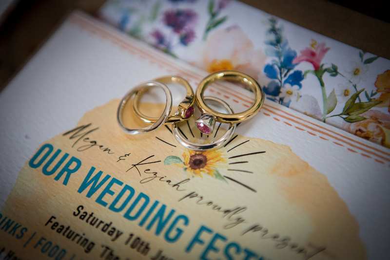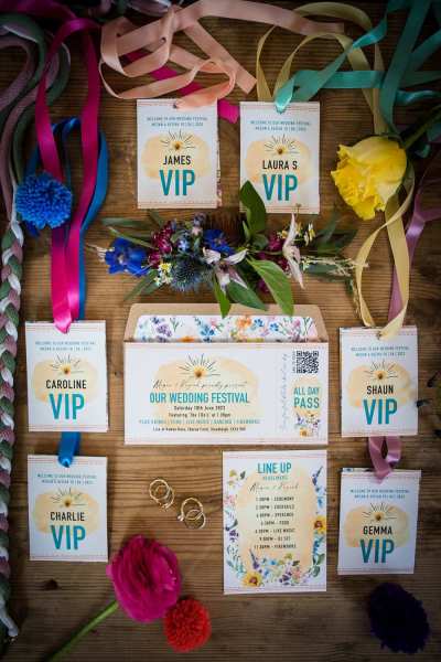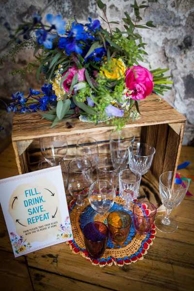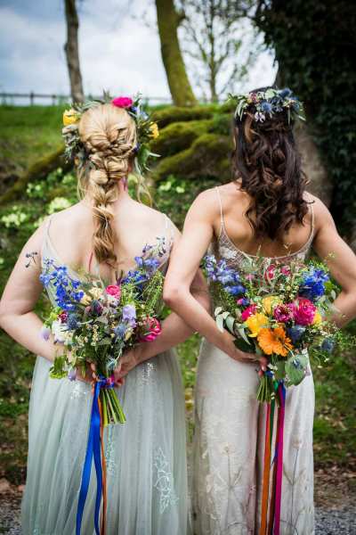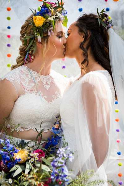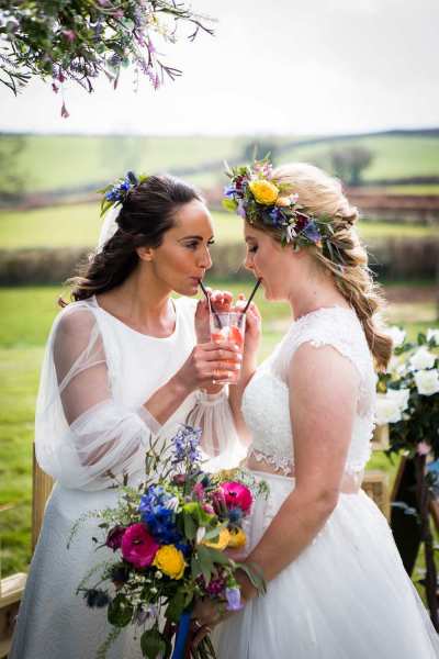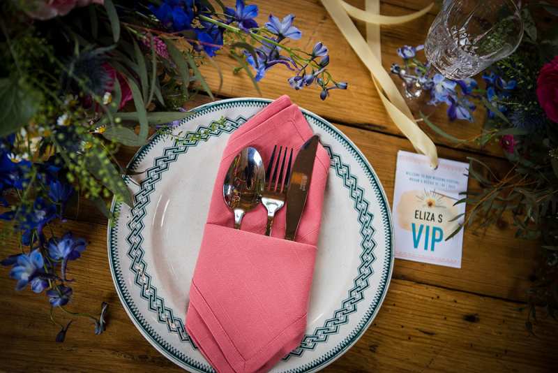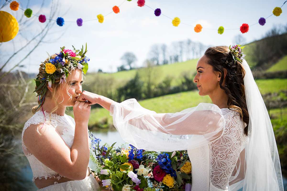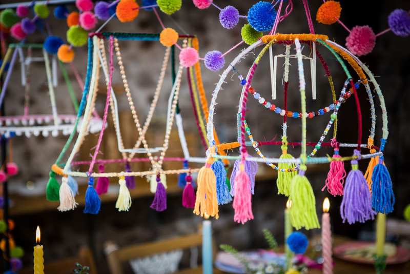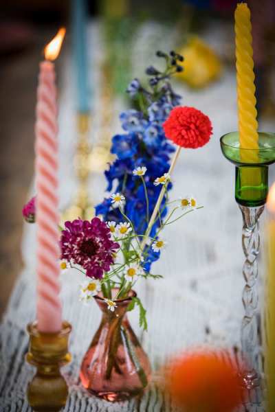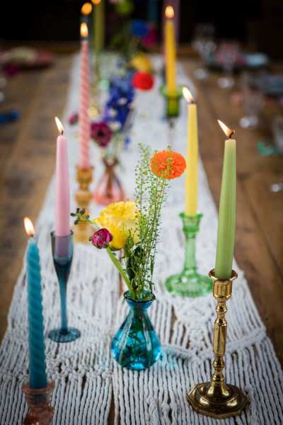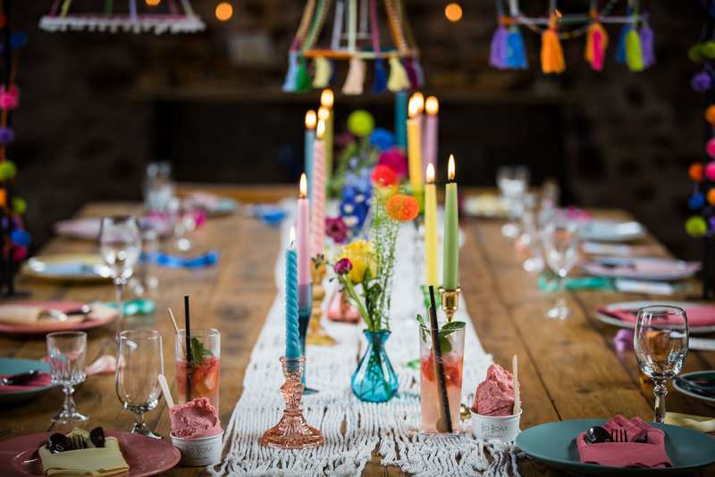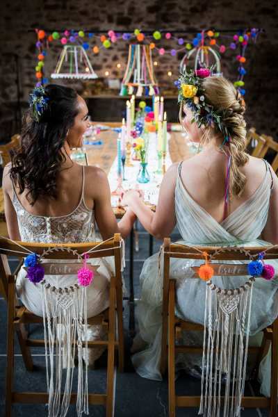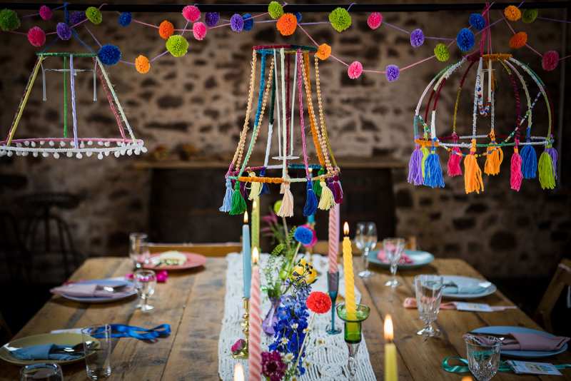 Merging elements of festival weddings with rustic chic and sustainability, the theme of wild, individual and free-spirited beauty is laced throughout this styled shoot. The colour-pop florals carry the aesthetic perfectly from the bouquets to the flower crowns, floral fascinator and potted arrangements. Bright paper pompoms adorn both the ceremony arch and reception space, where tablescapes continue the look with vibrant tapered candles, glassware and charger plates alongside vases with bright stems and hanging décor that draws the gaze upward to a canopy of colour.