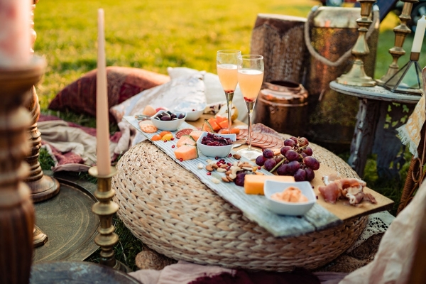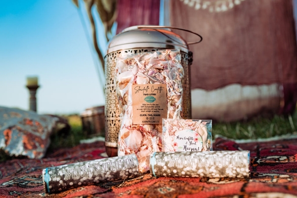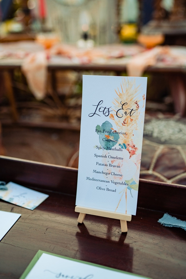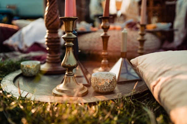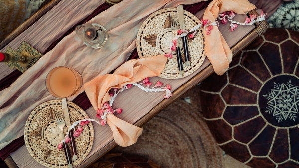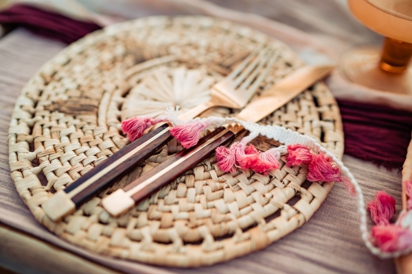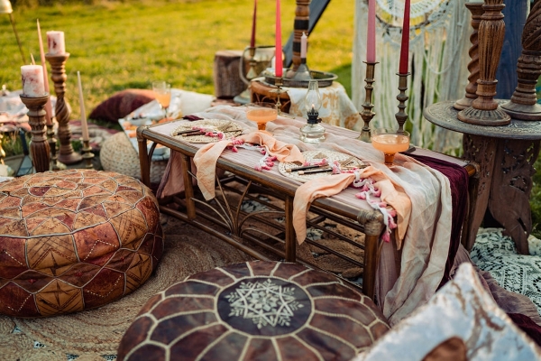 The scene is awash with interesting and sensuous detail, from the marbled blush cake to the delicate floral motif stationery, string lighting, pampas grass arrangements and array of props that provide a wonderfully eye-catching mix of metallic accents, rainbow brights and natural materials and include a fabulously oversized dreamcatcher. Moroccan style pouffes and rugs continue the layered look alongside a smattering of soft furnishings such as cushions and throws, while candelabras and vases in a mixture of metal and wood extends the glamour-meets-boho aesthetic.