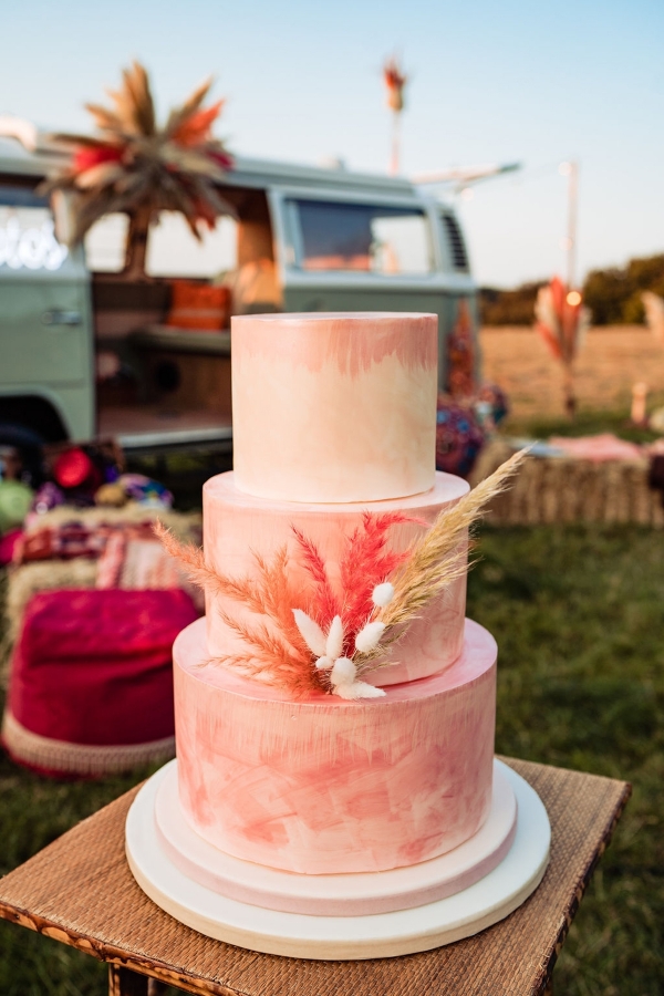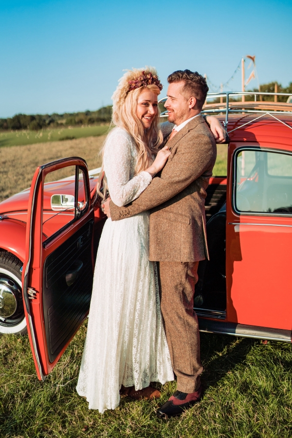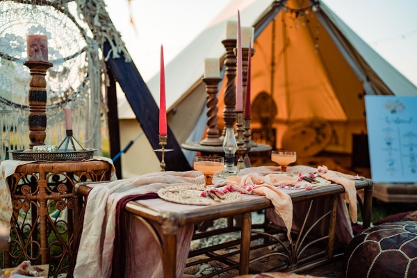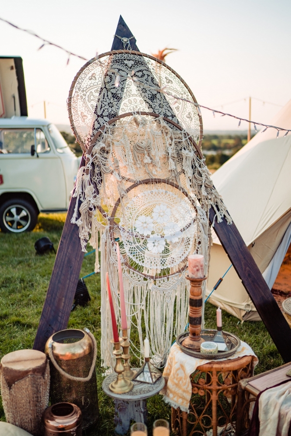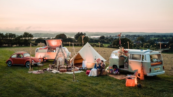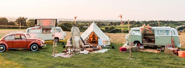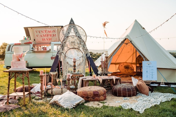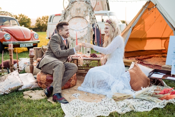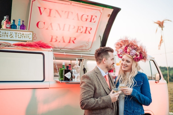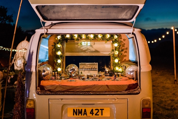 Not only do the vintage cars and campers provide a stunning statement feature, but they double up as transportation and entertainment to boot, treating our couple to a glitter bar, mobile drinks and photo booth for glamour and giggles in equal measure, while a beautiful tipi adds a snug boho space - the perfect chill out zone.