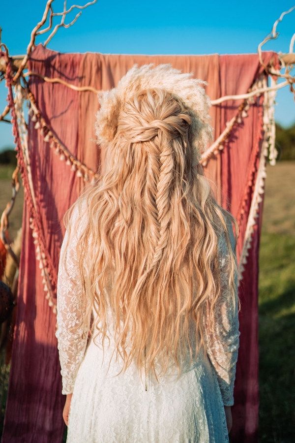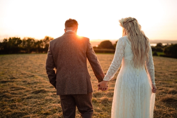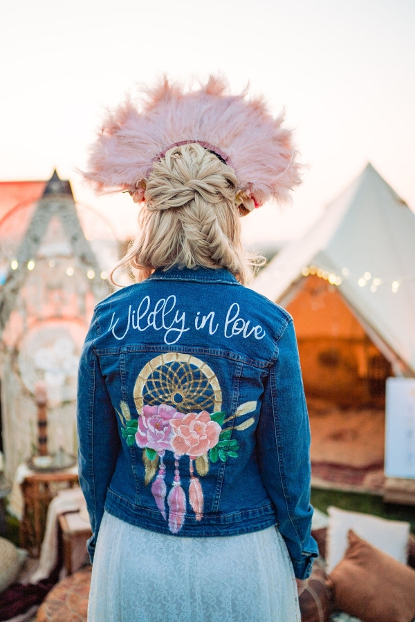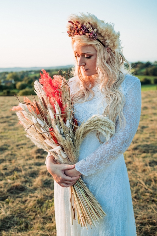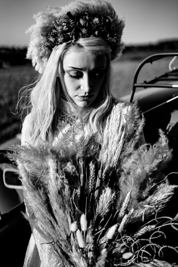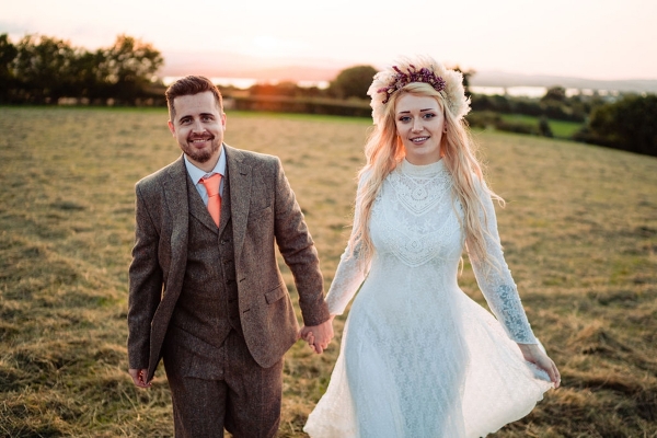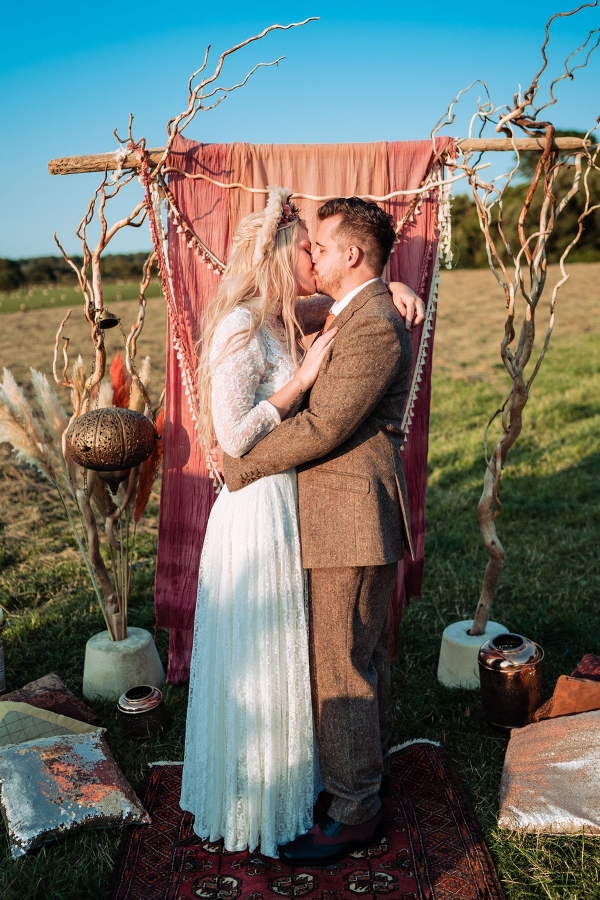 And let's not forget the style factor. Our bride is a vision of bohemian romance in long-sleeved lace accessorised with a jaw-dropping floral headdress and bouquet to match, hair loosely woven and freely flowing which - paired with a rock chick denim jacket - lends the right amount of relaxed edge to the ensemble. Meanwhile, the groom is dapper in an on-trend tweed suit in a voguish nut brown, which nods to the overarching natural theme of the shoot.