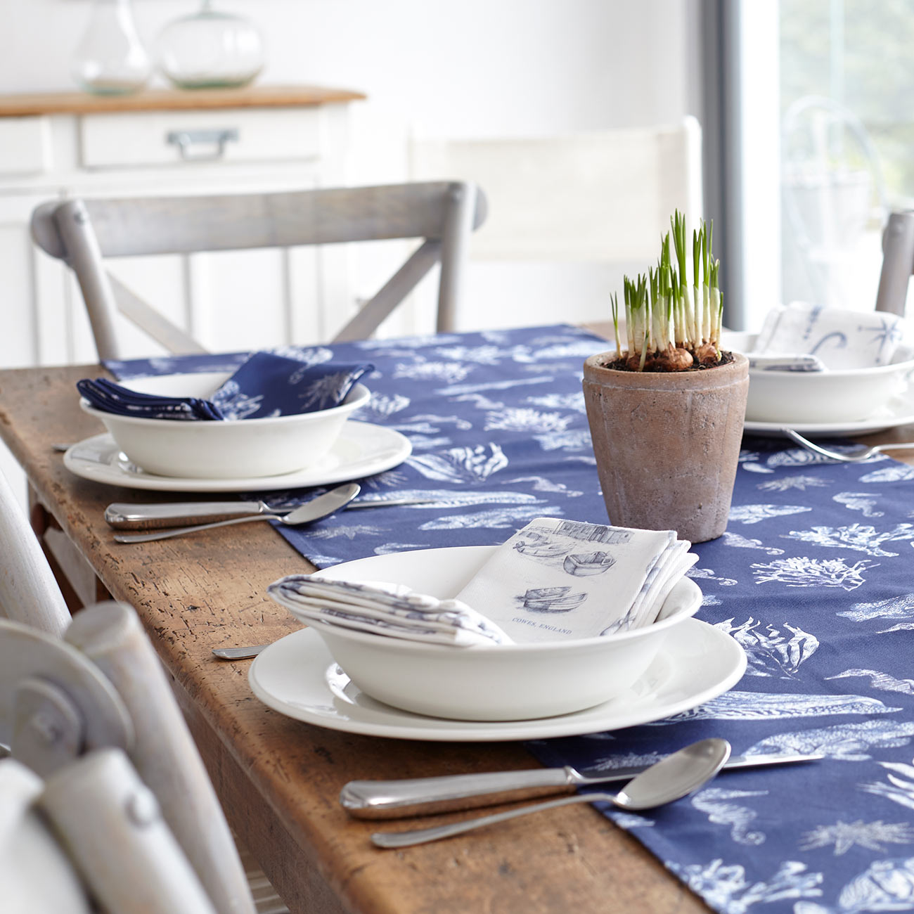Weave a marine theme into your linens for a tablescape that evokes a love of coastal living. The stunning nautical designs from XV Stripes will bring your seaside décor to life. From the Seaview organic cotton table runner to napkins, the beautiful deep blue and crisp white linens feature hand-drawn sea-inspired artwork, printed and made in the UK.