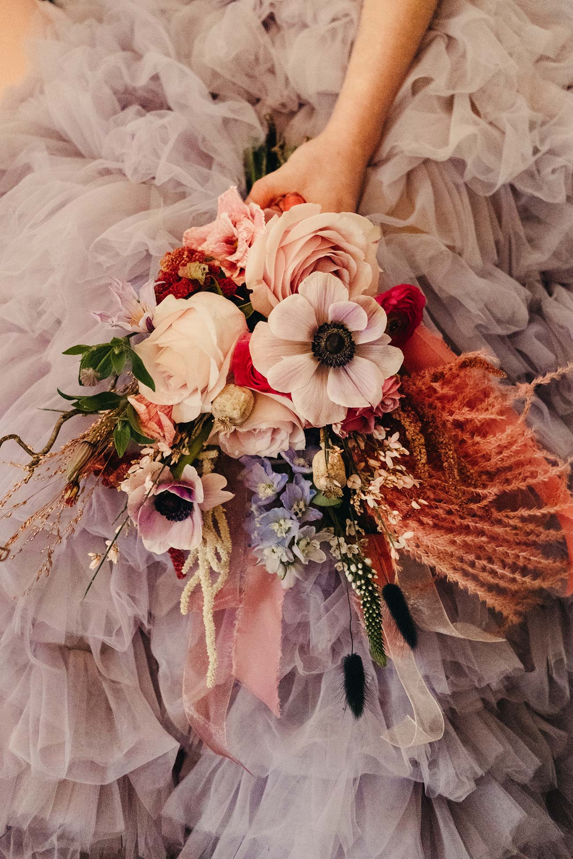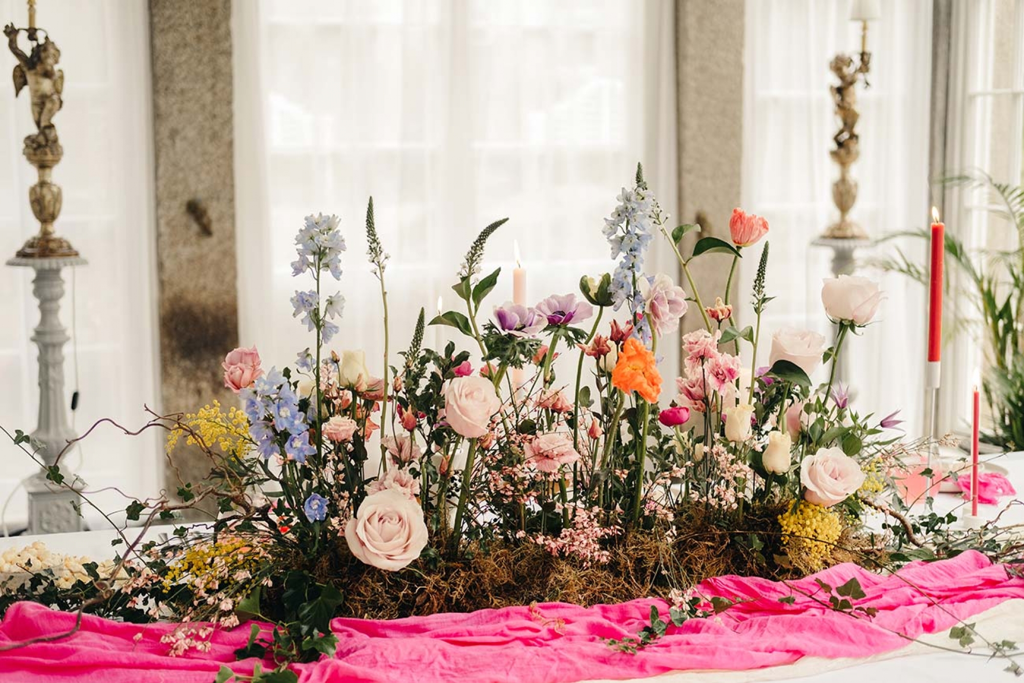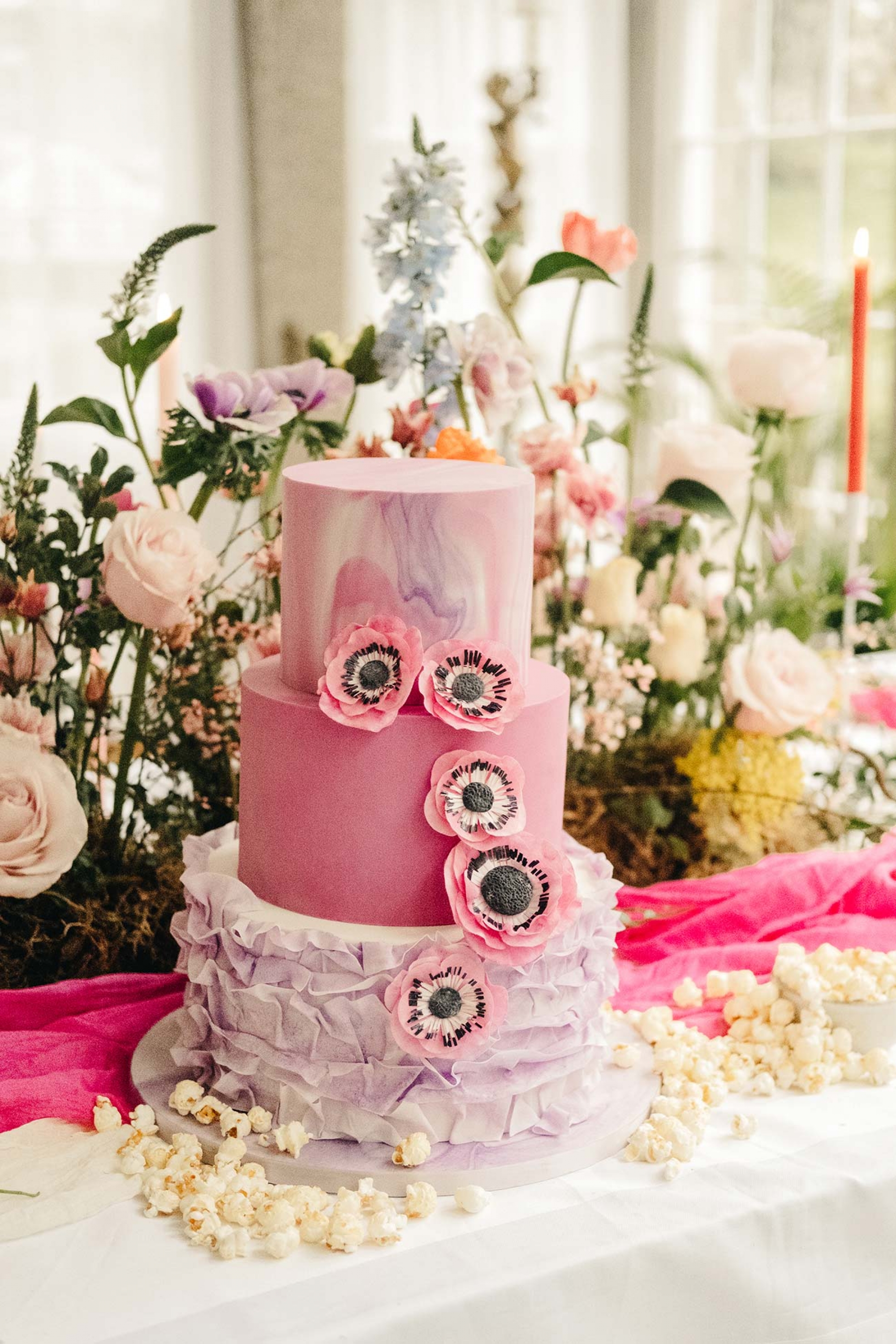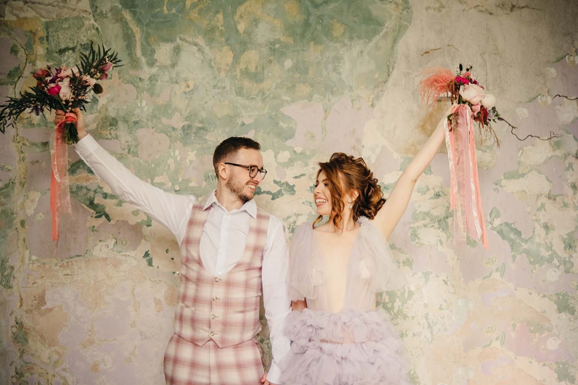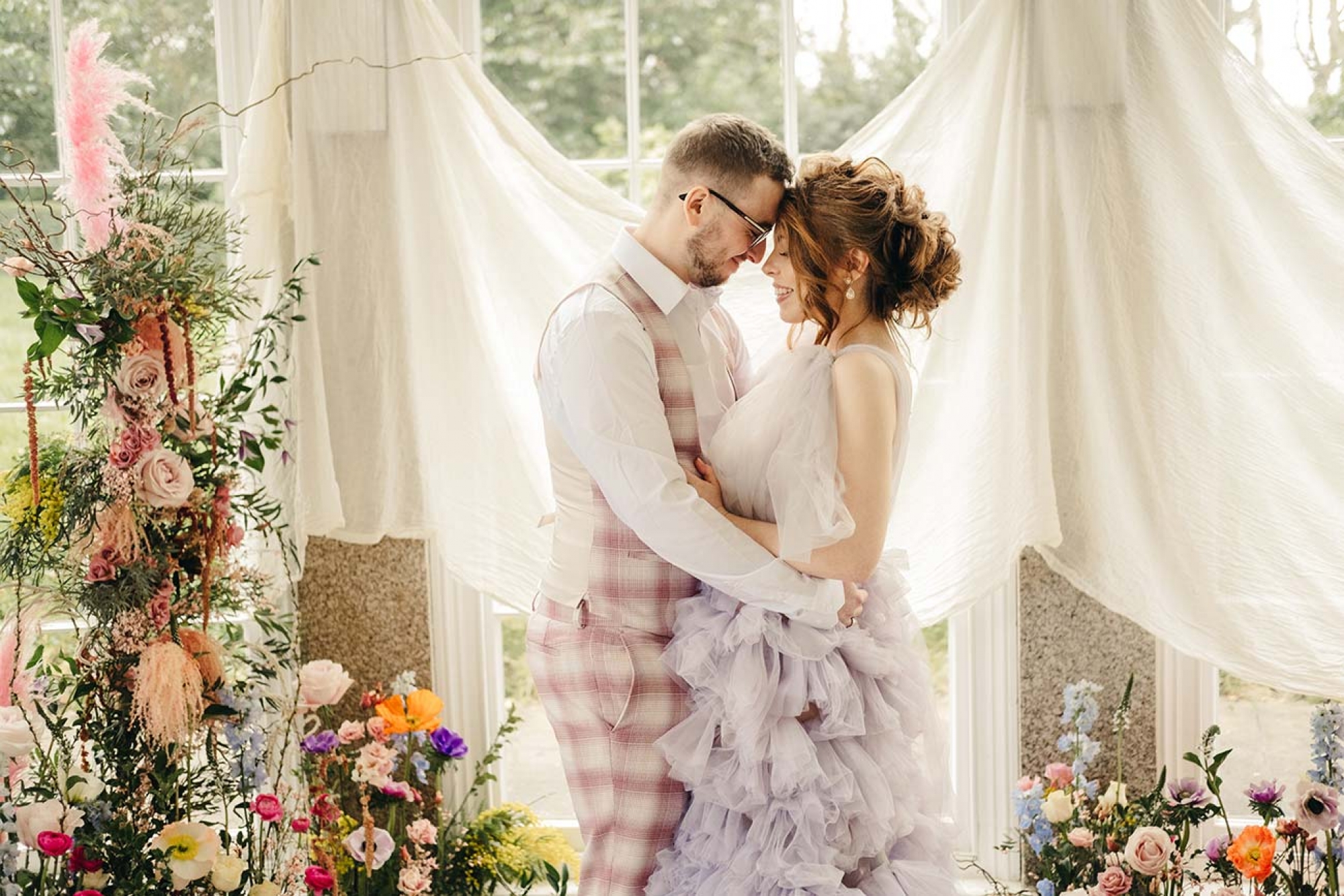 The bride and groom perfectly carry the exuberant vibe in their brilliantly individual ensembles. Cascading with lavender ruffles, the voluminous gown is as romantic as it is playful, while the groom's modish pink check suit complements the look with fashion-forward edge. Their palpable joy is the perfect finishing touch for Âthe vibrant scene ' a veritable feast for the senses.