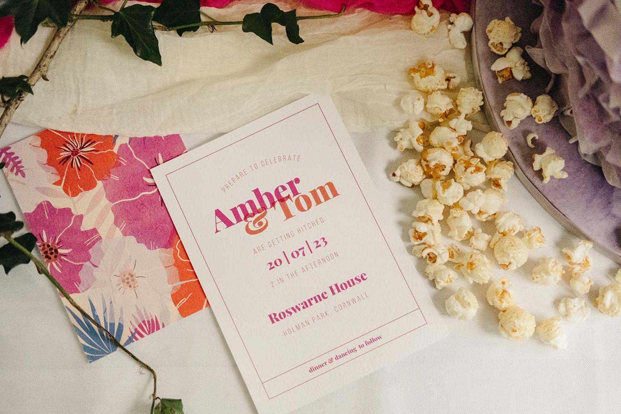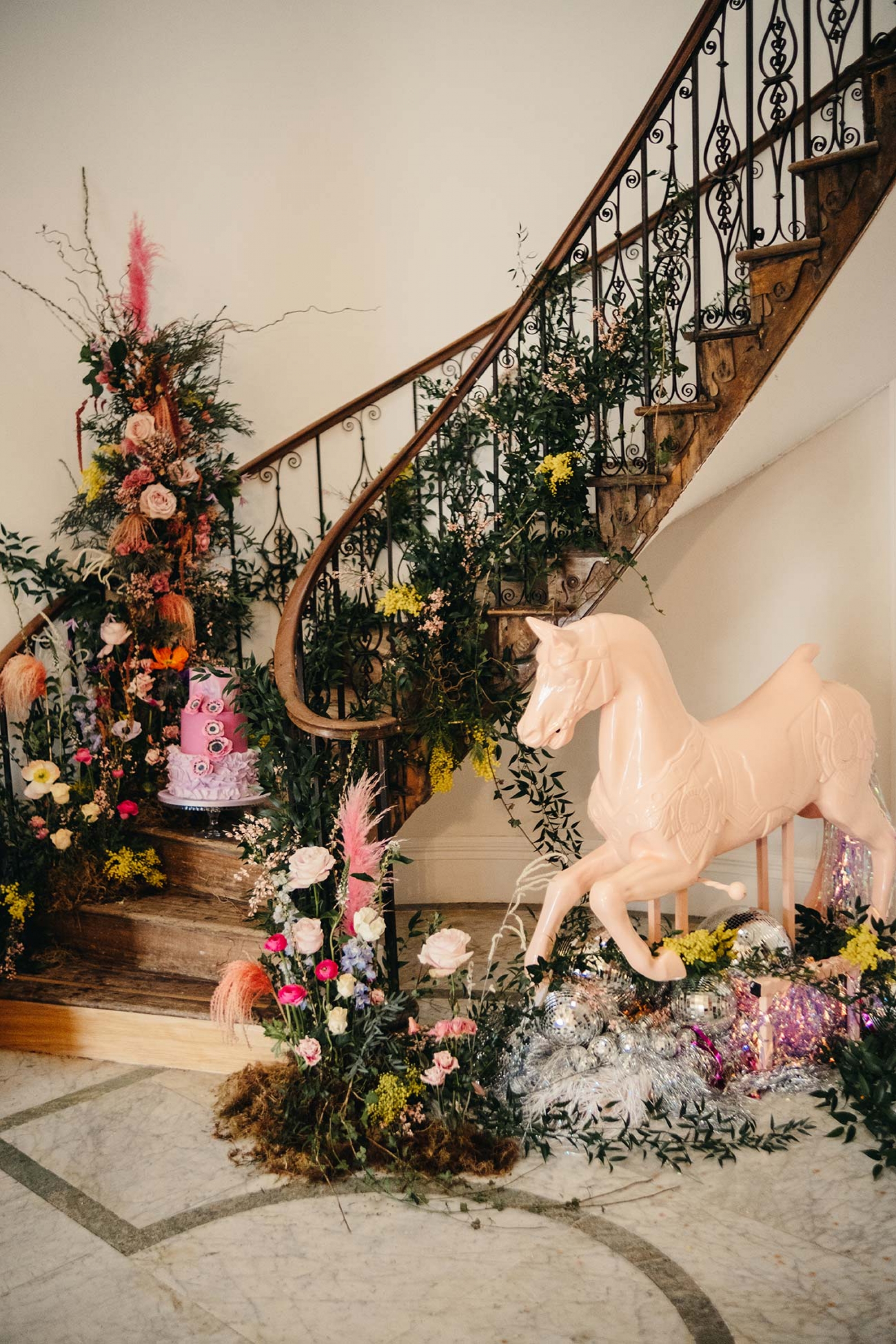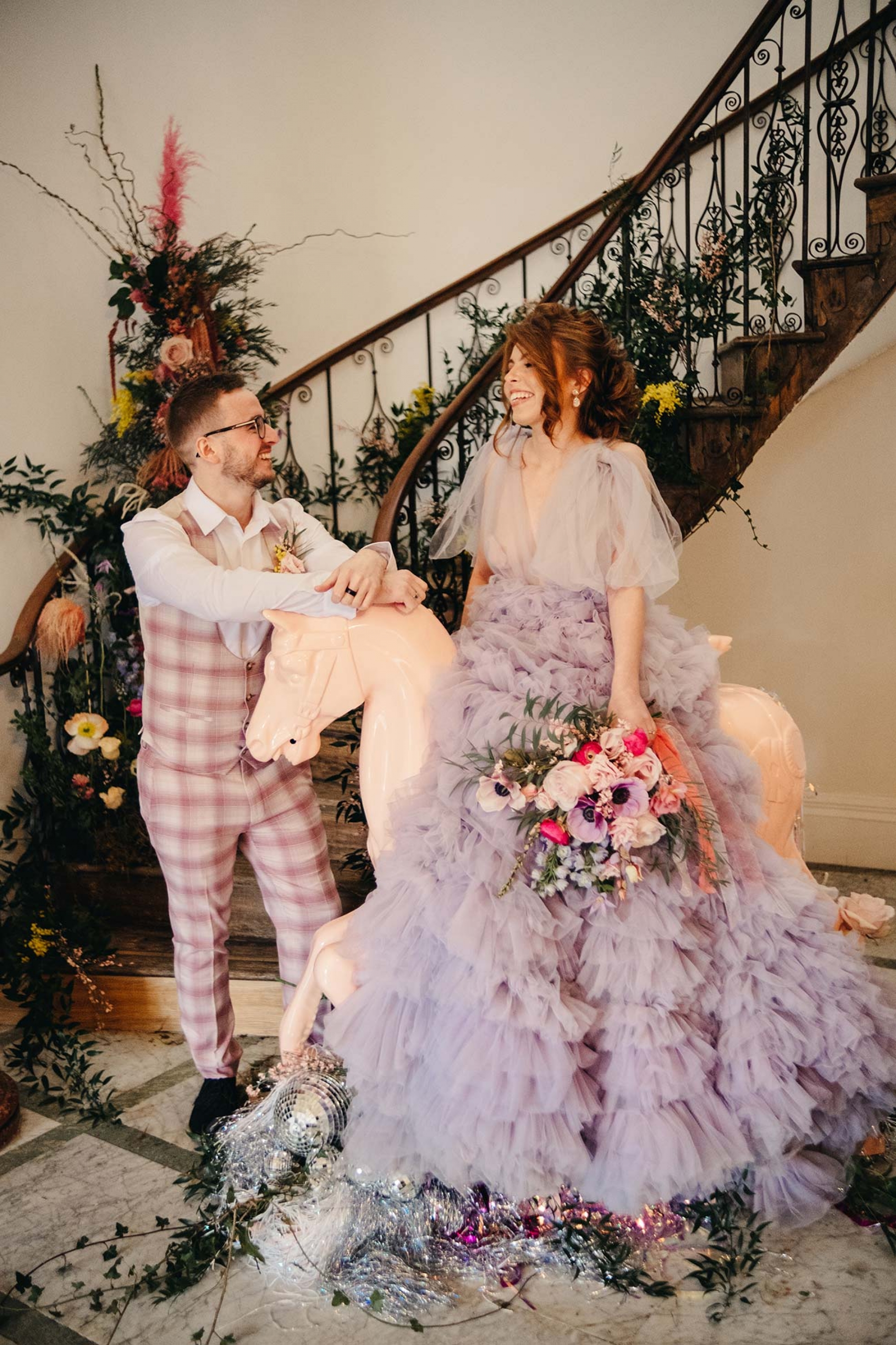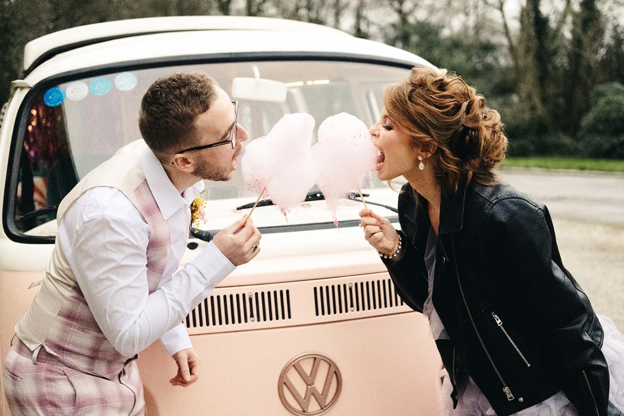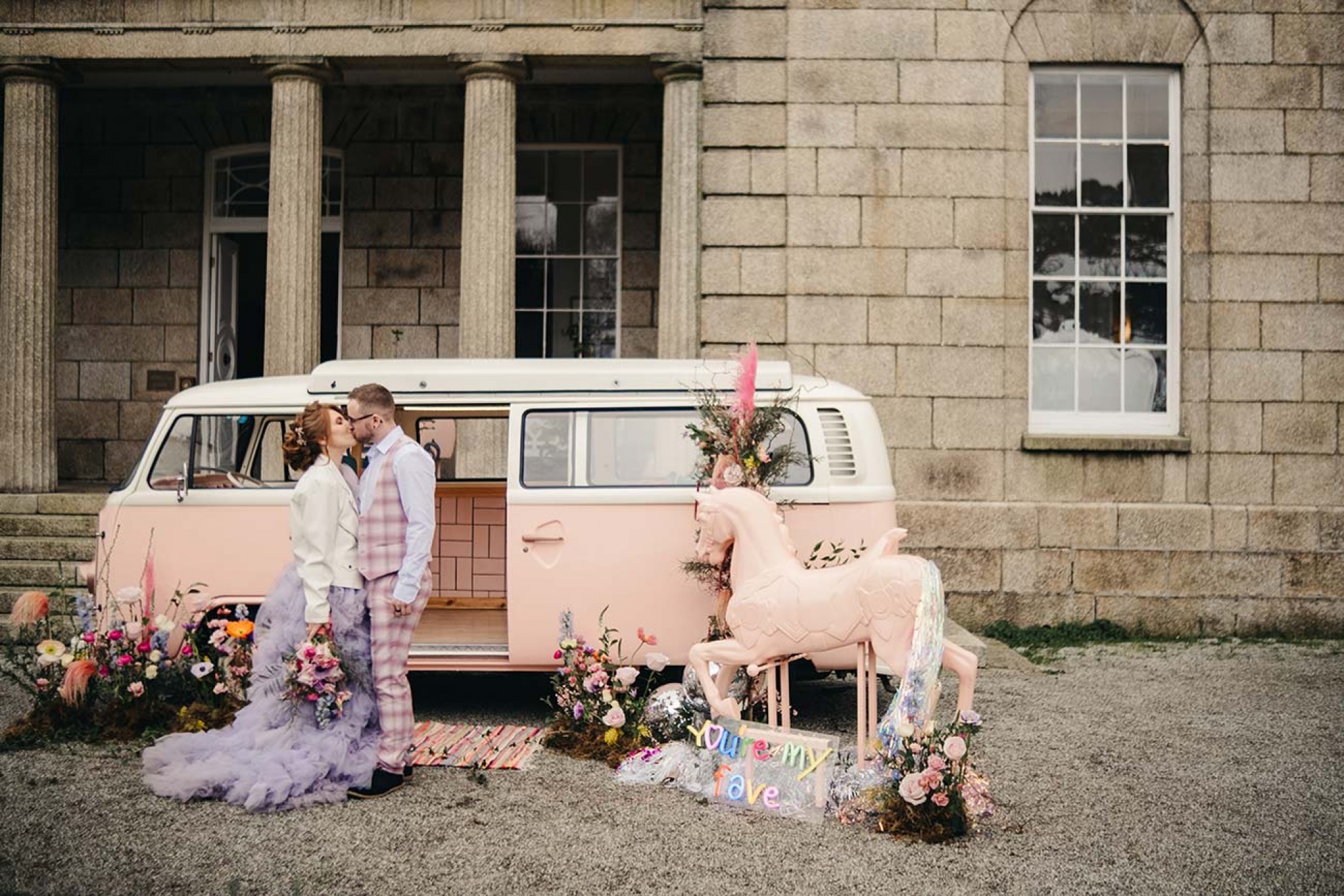 The lovingly restored Regency climes of Roswarne House makes the dream canvas for the riot of colour and playful detail. Shades of lilac and punchy pink meet pops of yellow and tangerine in the florals which bring glorious colour to the tablescape, the ceremony setting and the staircase, while the florals, ruffles and marbled tier of the cake exemplifies the 'more is more' aesthetic. Colourful stationery, funfair ticket place names, popcorn and candyfloss add to the theme; and, complete with a carousel horse, a sugary pink VW campervan photo booth makes a fun-filled focal point for the celebrations.