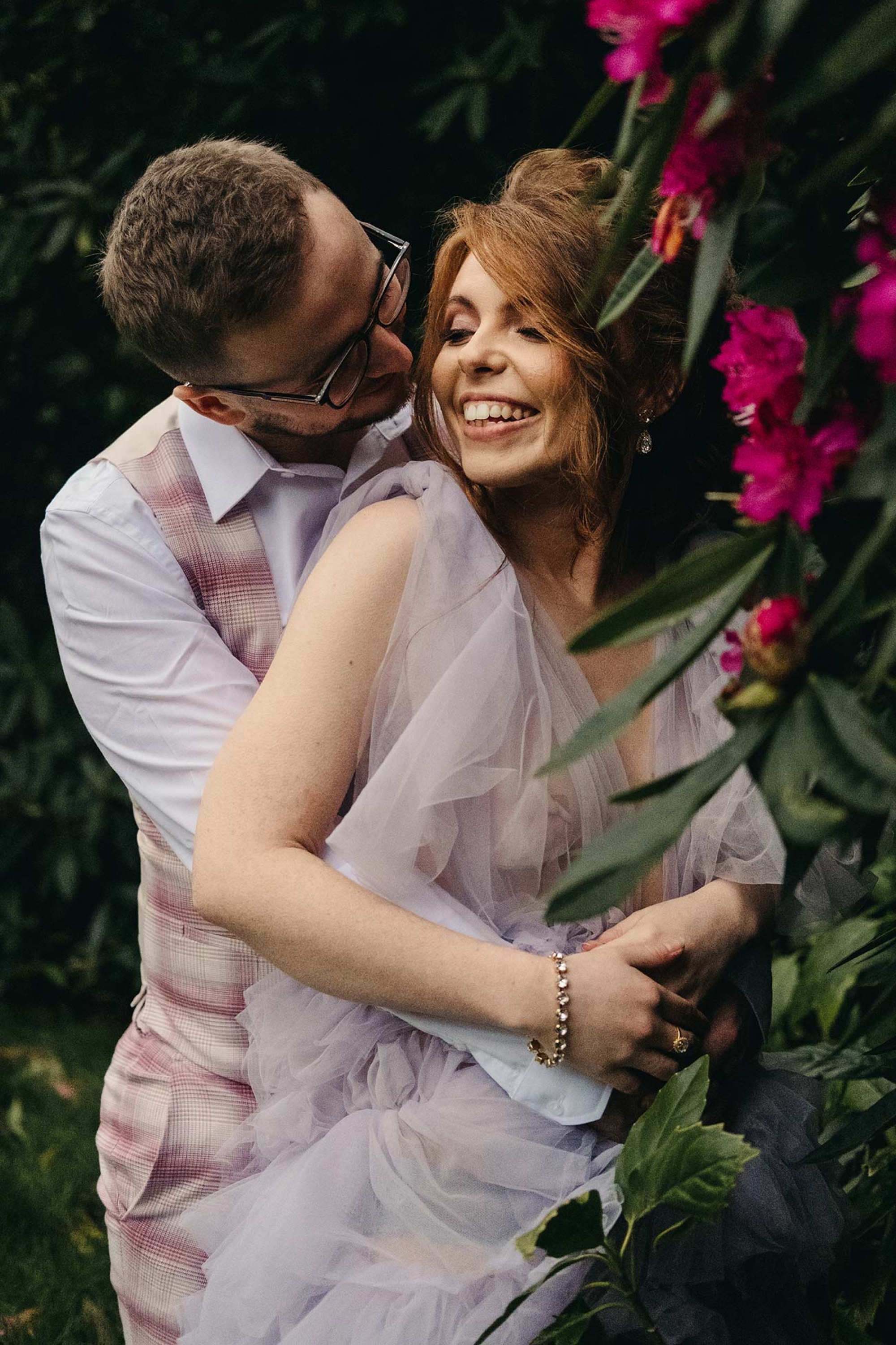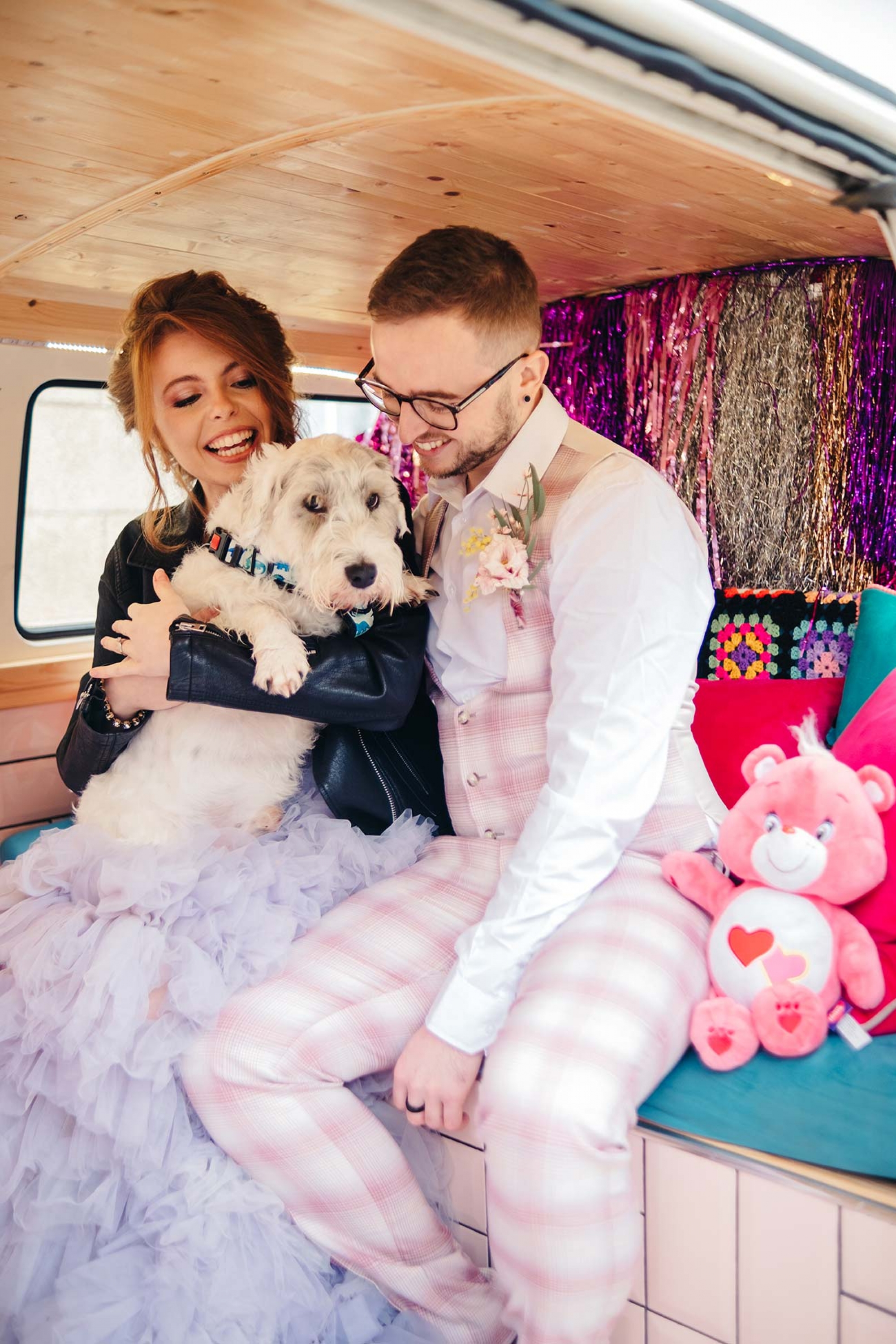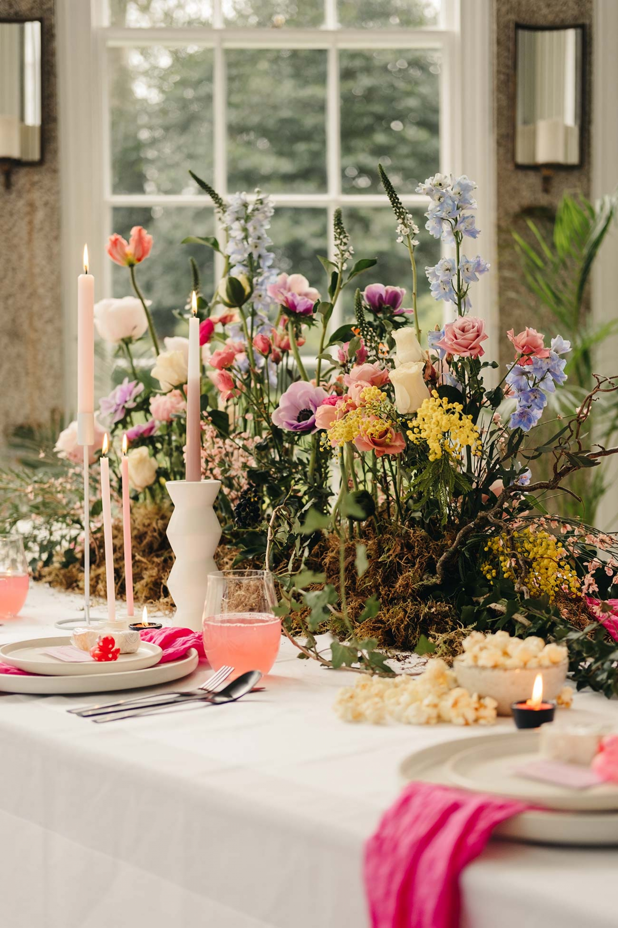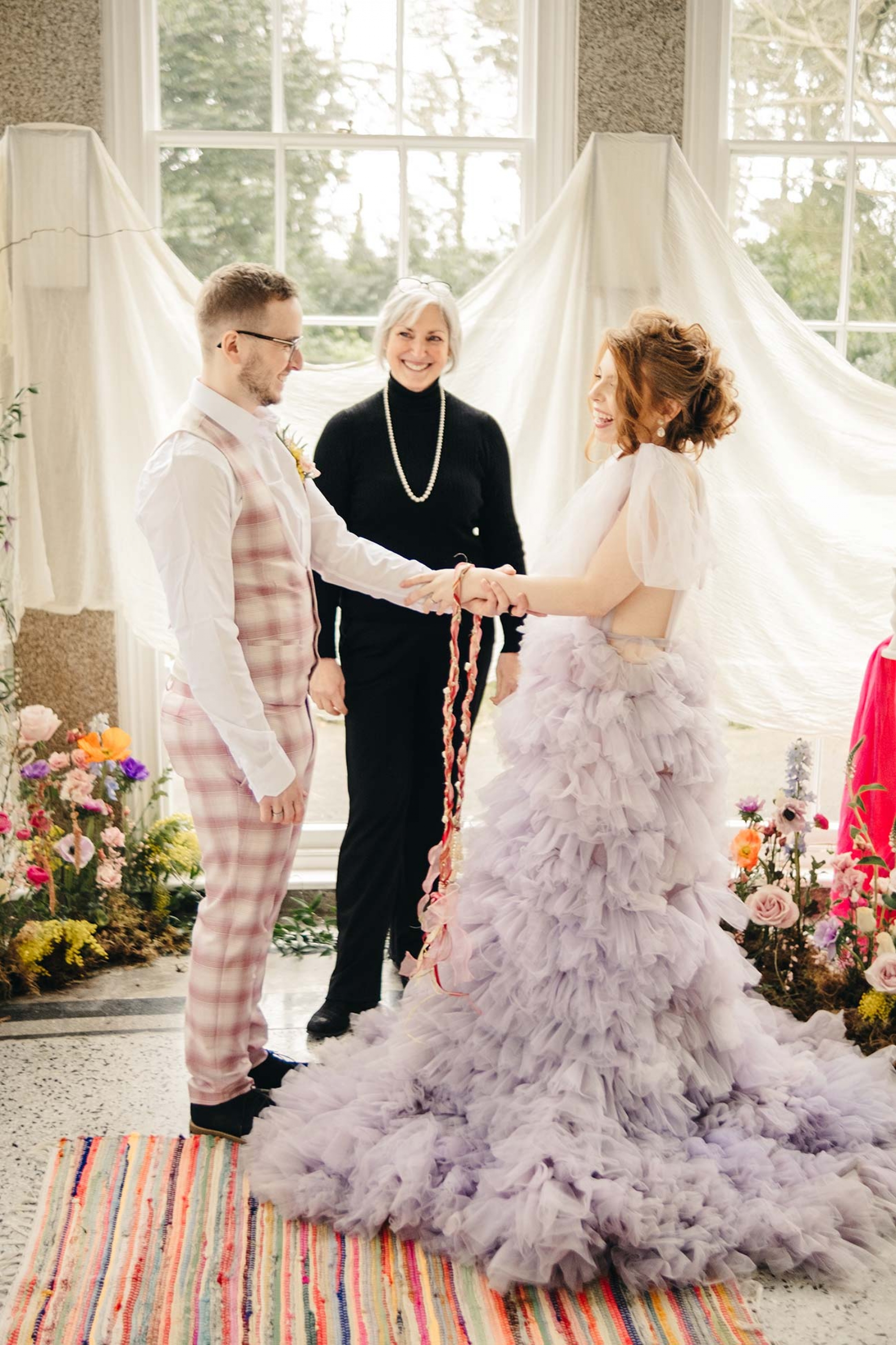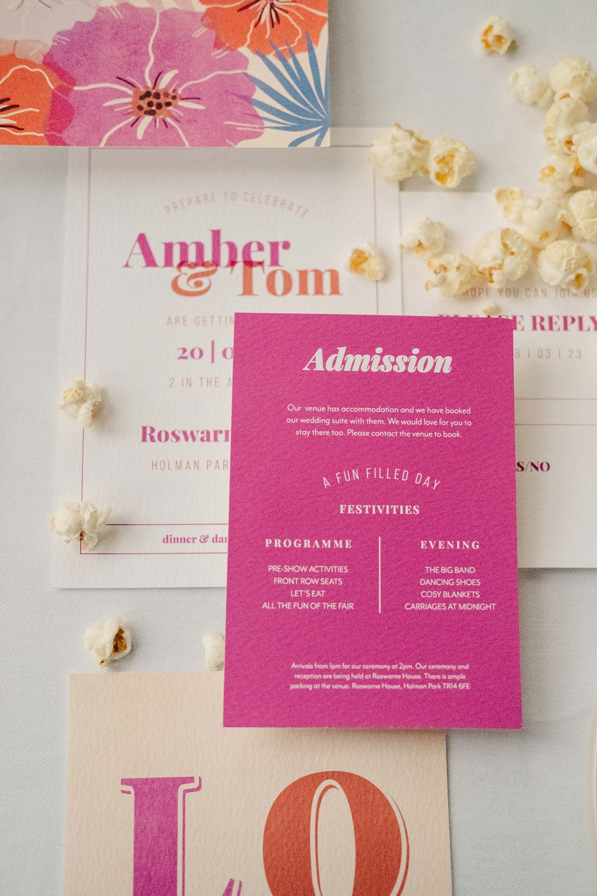 The lovingly restored Regency climes of Roswarne House makes the dream canvas for the riot of colour and playful detail. Shades of lilac and punchy pink meet pops of yellow and tangerine in the florals which bring glorious colour to the tablescape, the ceremony setting and the staircase, while the florals, ruffles and marbled tier of the cake exemplifies the 'more is more' aesthetic. Colourful stationery, funfair ticket place names, popcorn and candyfloss add to the theme; and, complete with a carousel horse, a sugary pink VW campervan photo booth makes a fun-filled focal point for the celebrations.