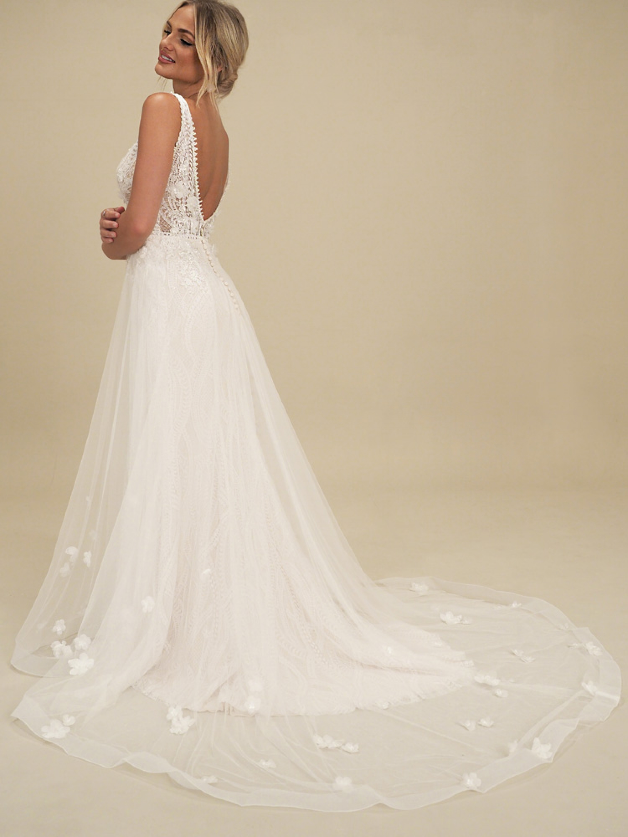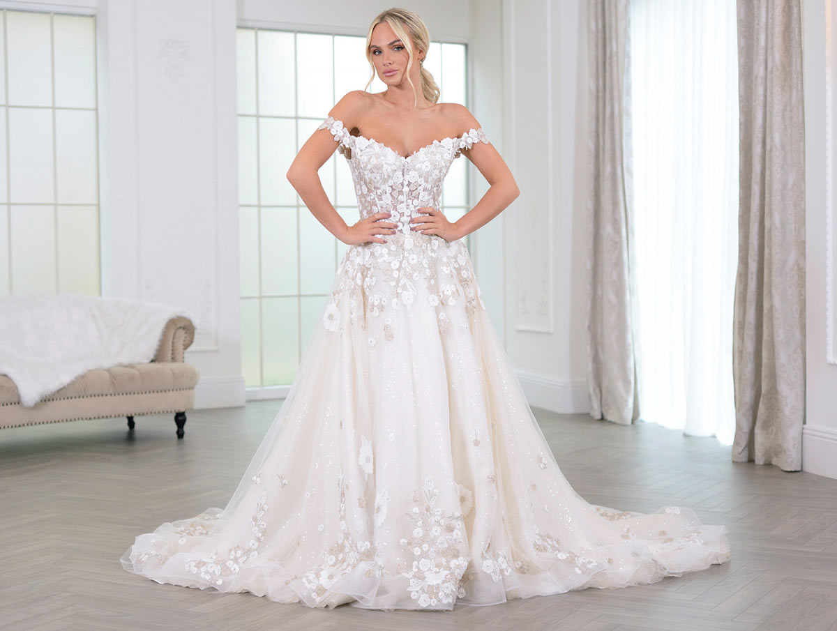 Take Emi, for example, whose ultra feminine illusion lace bodice with plunging neckline is paired with a floaty tulle skirt featuring 3D floral appliques. Or there's the figure-hugging crepe confection that is, Monaco, whose ornately beaded bodice screams pure seduction, making it the perfect fit for brides seeking something strikingly on-trend with a timeless twist.