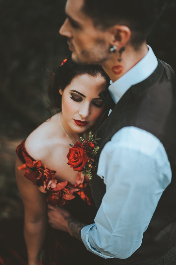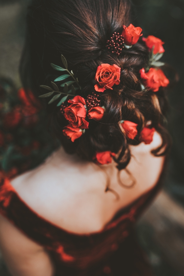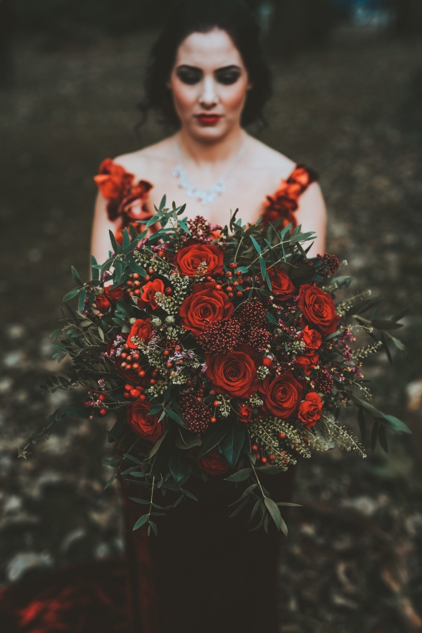 "I used velvet red Naomi roses to complement the velvet wedding dress and to give a rich look against the gold vases on the tables, along with red skimmia and berries to give texture and a natural feel," says Lin of Sweet Pea Floral Studio, who added bright red carnations and gerberas for a bright pop of colour to lift the darker reds.