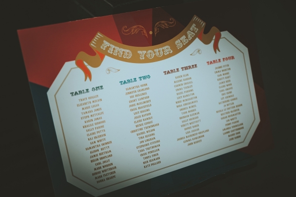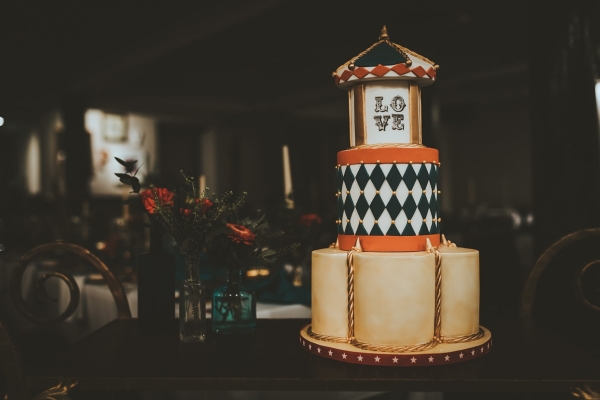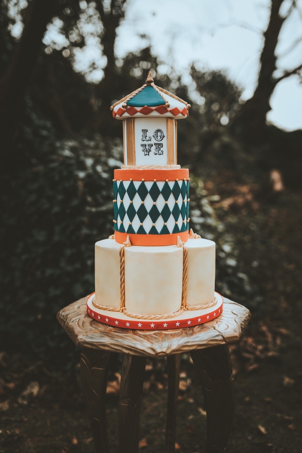 Stationery from Anon Design Studio helps set the tone, using geometrics as a nod to old-style fairground signage style, incorporating bright diamond patterns and strong lines. Place settings continue the theme, with spray-painted toy animals atop deep blue runner cloths, alongside gold vases and candlesticks. Gold chargers frame the vintage plates, which creates a bold contrast in style and added layering to the table, while, standing pride of place on an ornate vintage drinks trolley, is the carnival-inspired cake.