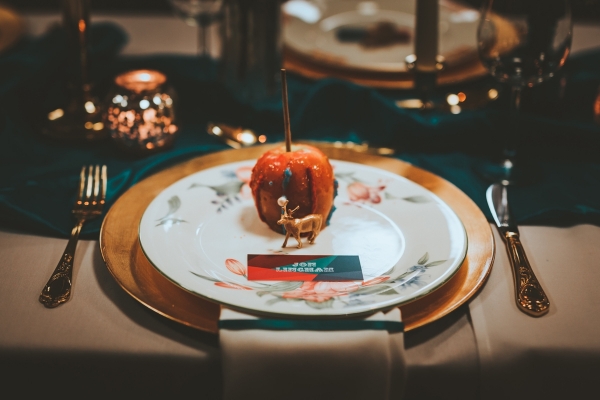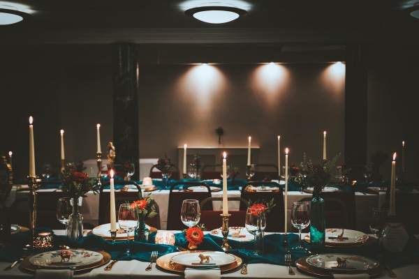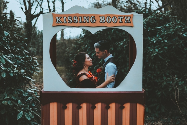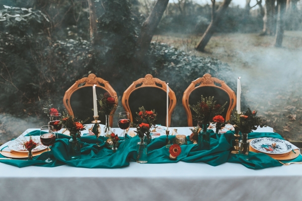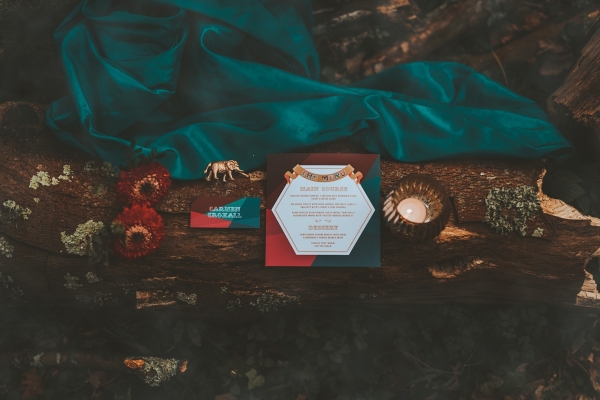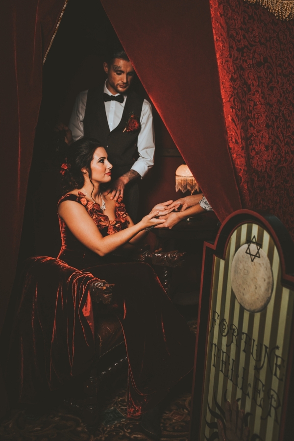 From a fortune teller's tent to vintage lampshades and a fairy-lit tipi, the quirky props infuse fun and a rich sense of personality, perfect for a carnival theme. In terms of colours, intense teal blues, poppy reds and gold are used to create a bold, bright and daring look for the tablescapes.