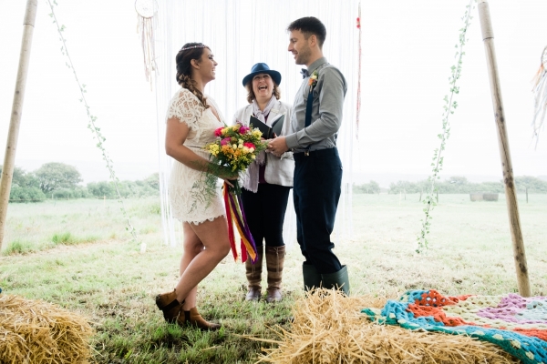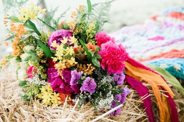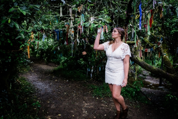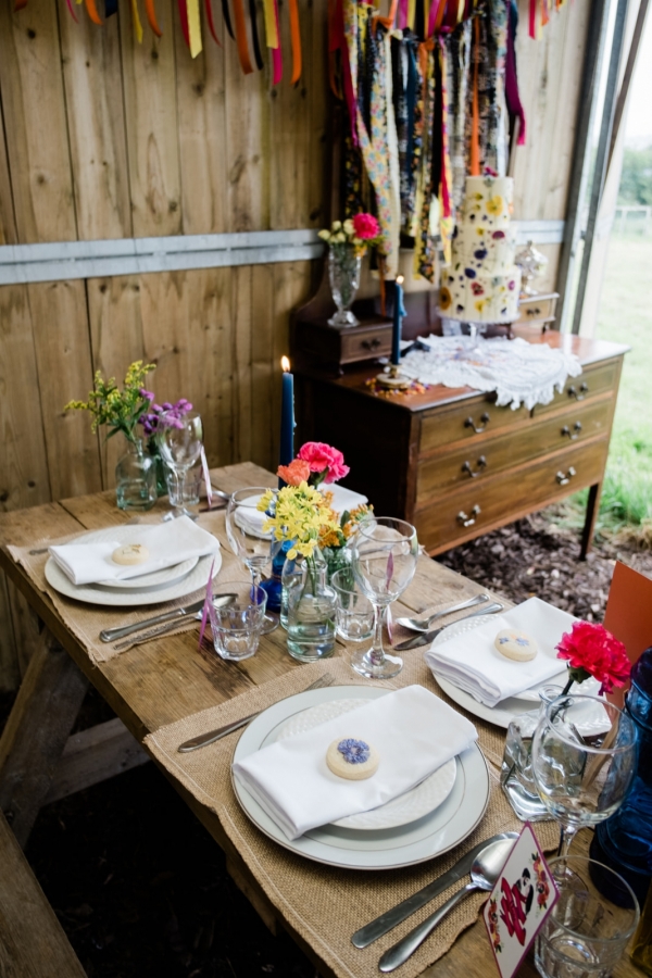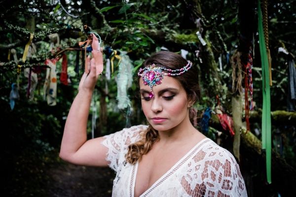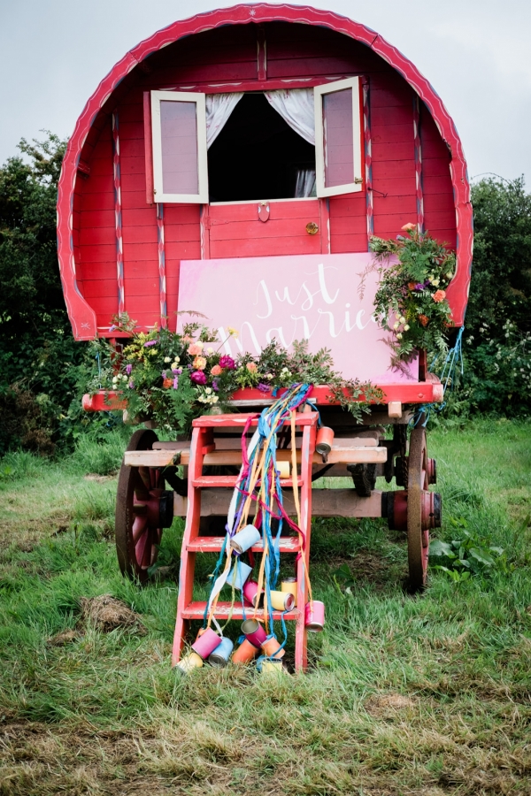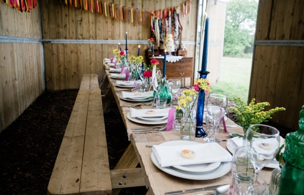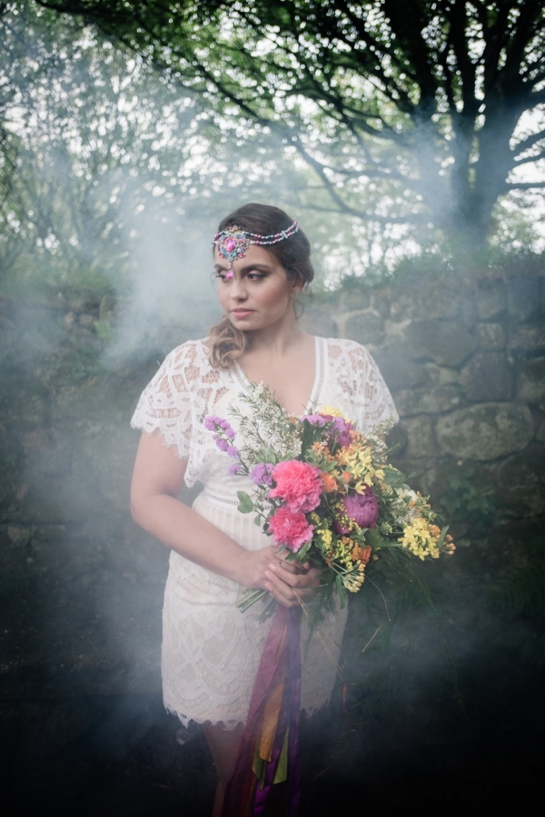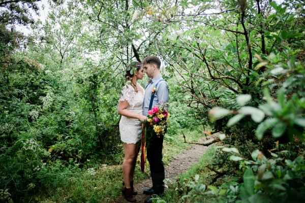 From the colourful floristry to the decor, every aspect combines to extend the look of the outdoors while providing a punchy and bright festival feel. The exquisite lace gown (a charity shop find) is the perfect balance of informal and chic with a boho edge, while the groom's bow tie and braces combo reflects the relaxed dress code. And with hair and make-up designed to give our bride a naturalyet bohemian look complemented by a unique headpiece in jewel tones, it's a swoon-worthy vision of a modern boho bride.