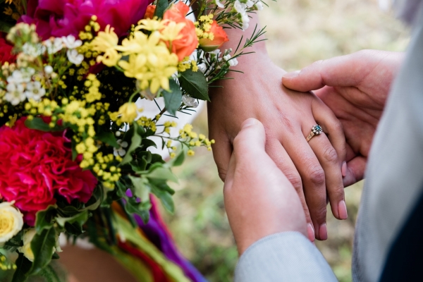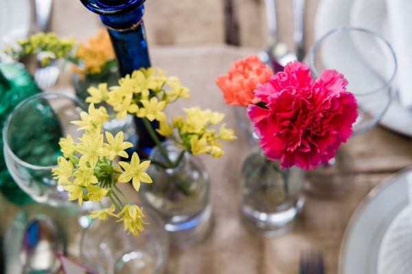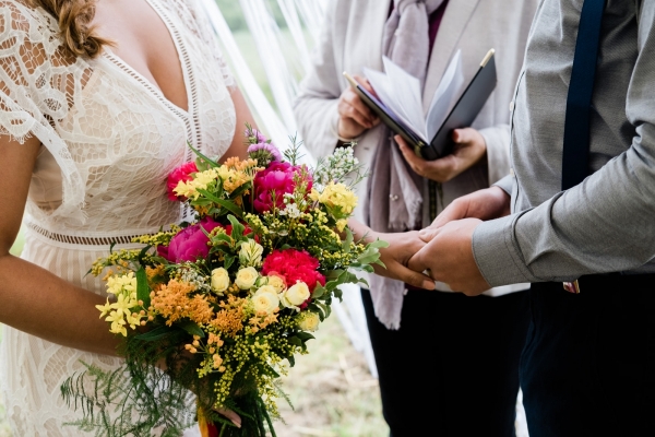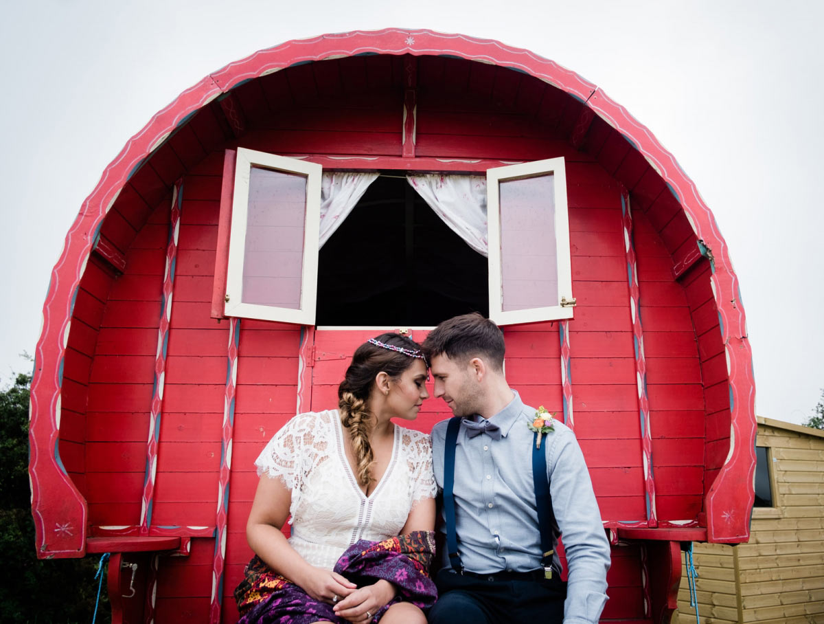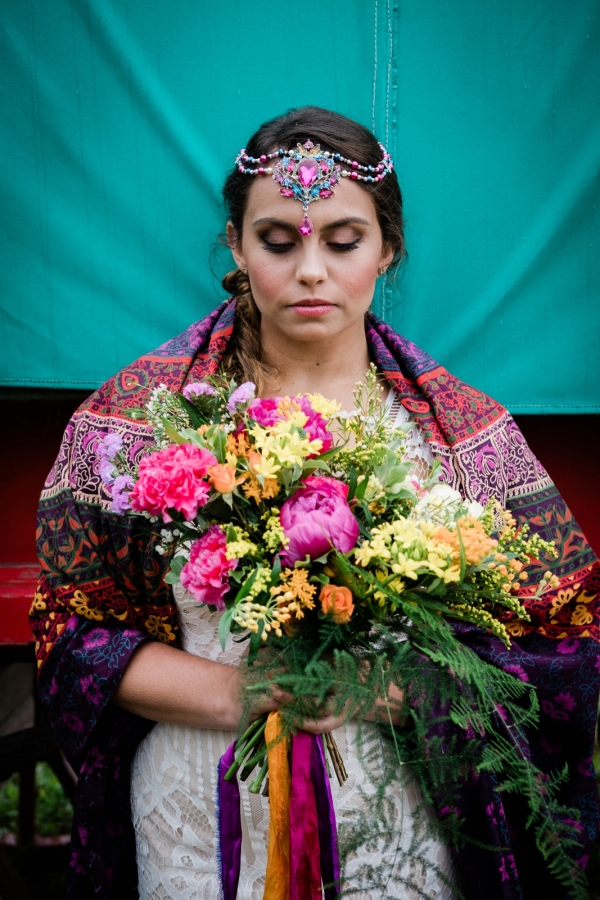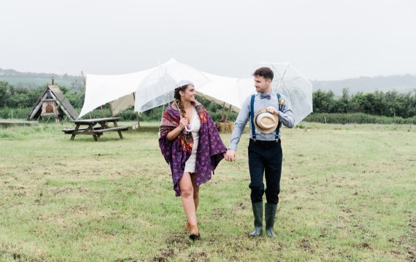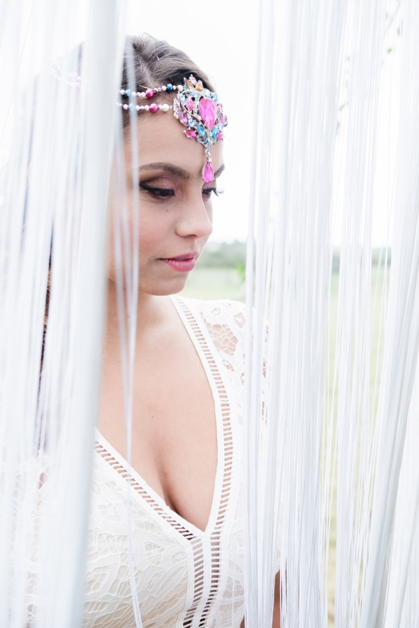 From the colourful floristry to the decor, every aspect combines to extend the look of the outdoors while providing a punchy and bright festival feel. The exquisite lace gown (a charity shop find) is the perfect balance of informal and chic with a boho edge, while the groom's bow tie and braces combo reflects the relaxed dress code. And with hair and make-up designed to give our bride a naturalyet bohemian look complemented by a unique headpiece in jewel tones, it's a swoon-worthy vision of a modern boho bride.