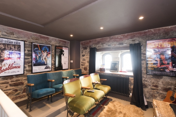 Then there's the living space. Situated on the seventh floor, exposed stone walls meet wooden flooring and a balcony opening up onto those captivating views, while on the floor above you'll find a library presenting 360-degree panoramas, and a cinema room on the floor below complete with original velvet cinema chairs and big screen.