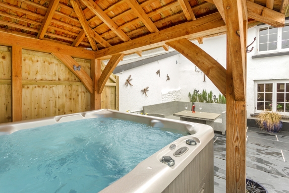 Enjoy alfresco evenings in the Mediterranean style garden with large seating area and table, followed by a soak in the private Beachcomber hot tub, tucked under a gazebo for you to enjoy all year round.