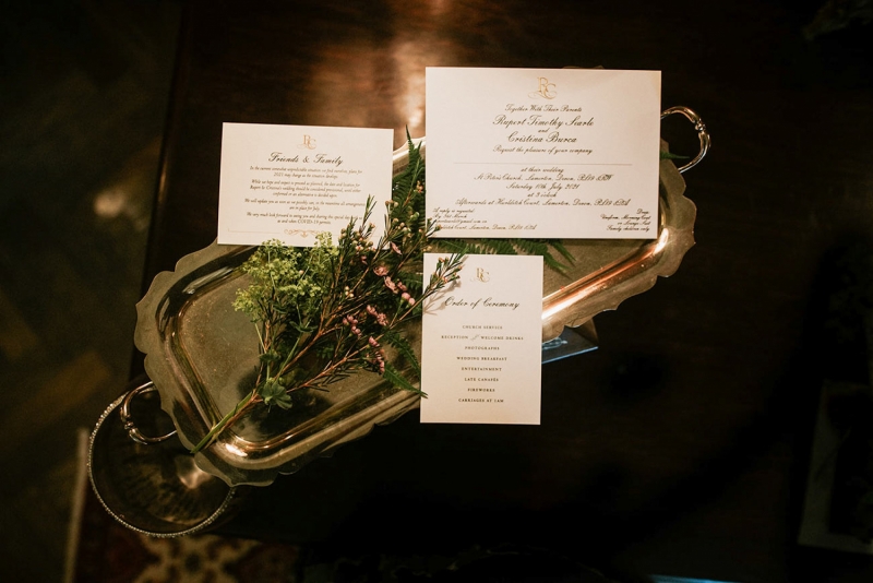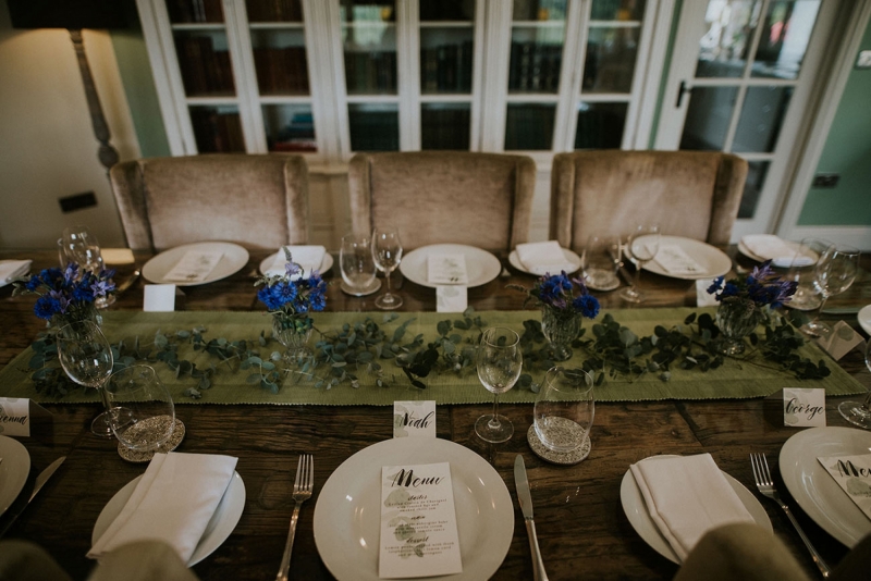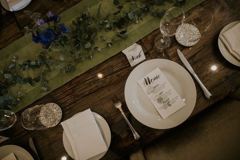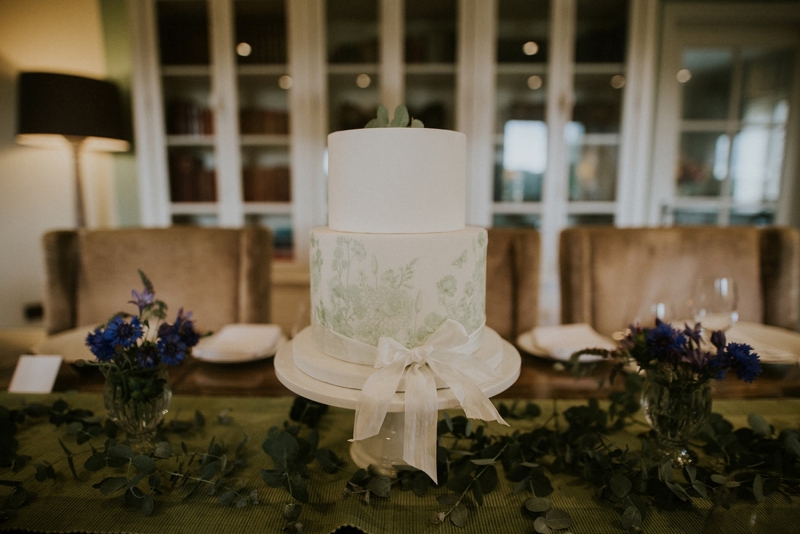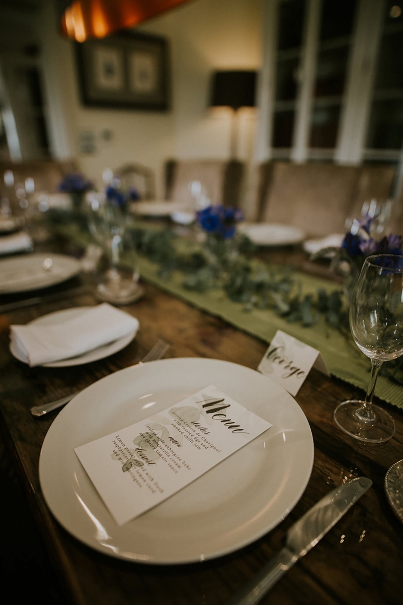 Inside, the reception space continues the botanical theme courtesy of a green table runner scattered with foliage and tiny vases of colour pop blooms in indigo and violet. The table settings are elegantly dressed with stationery featuring botanical motifs, while the glassware, crockery and cutlery remain plain and simple to allow the space to breathe and subtly shine. The two-tier hand painted cake requires just a single ribbon for adornment and provides the chicest centrepiece that also works to tie the scene together to visually stirring effect.