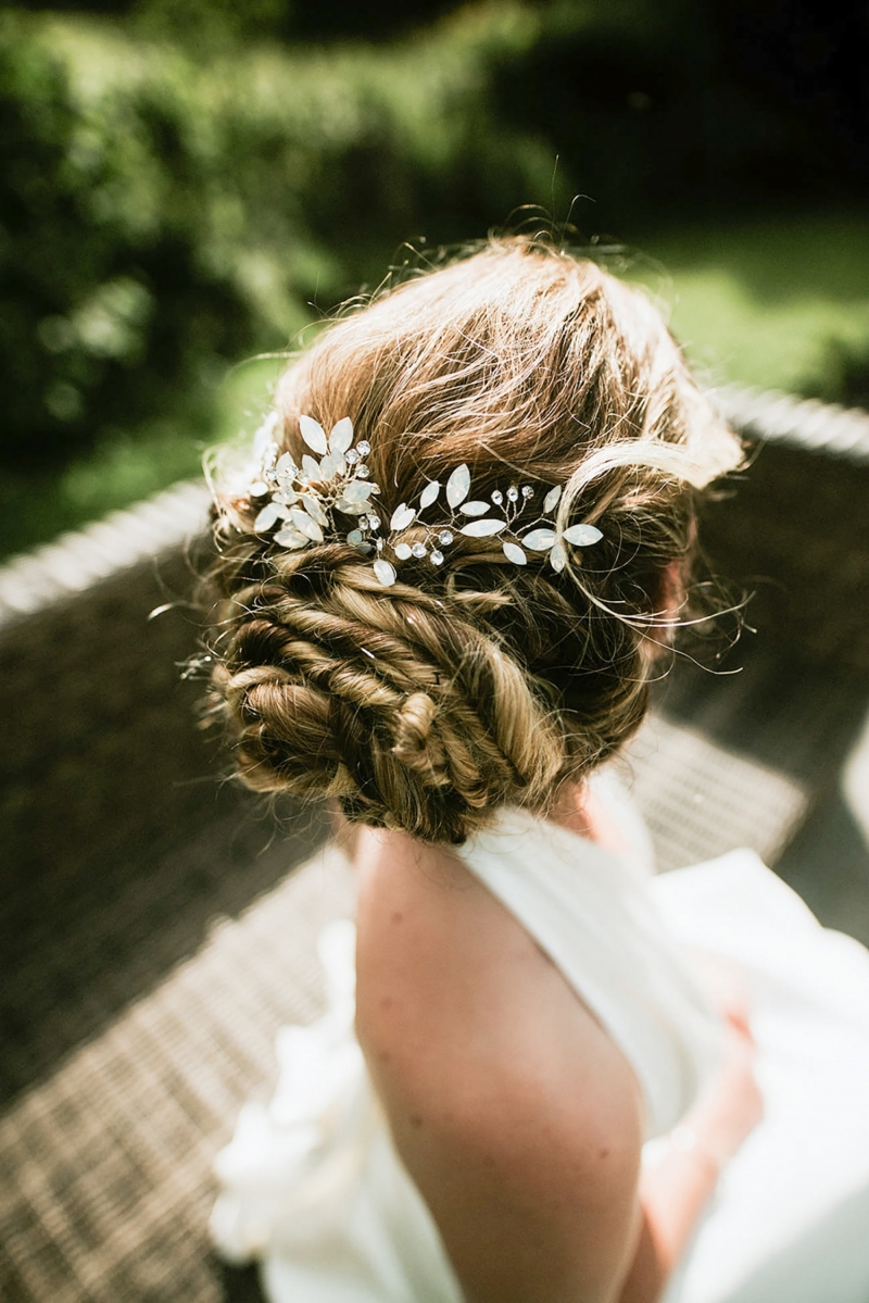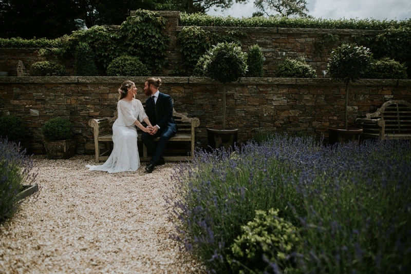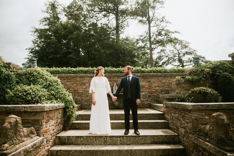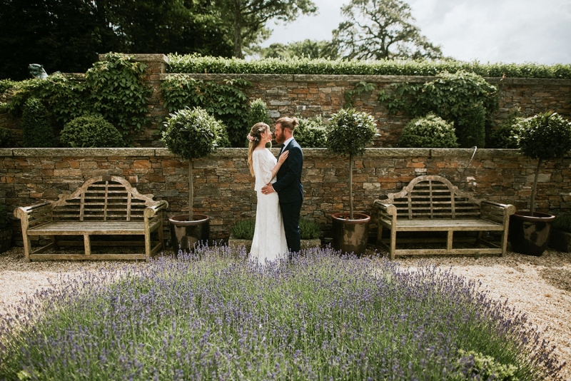 The dress code merges a sense of timeless glamour with whimsical detail, first with a stunning lace two-piece with flutter sleeves and then with a heavenly halterneck with a modern fairytale edge. A fresh flower headpiece with wavy free-flowing locks, then a braided ballet style bun decorated with a floral fascinator finishes each lust-have look. The groom is equally as eye-catching in a suave three-piece complete with on-trend fern green waistcoat followed by a sage windowpane suit: both the epitome of country cool.