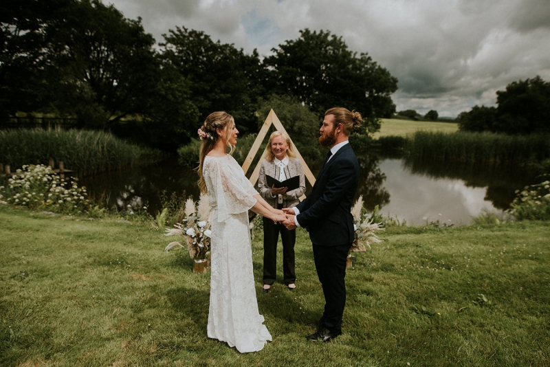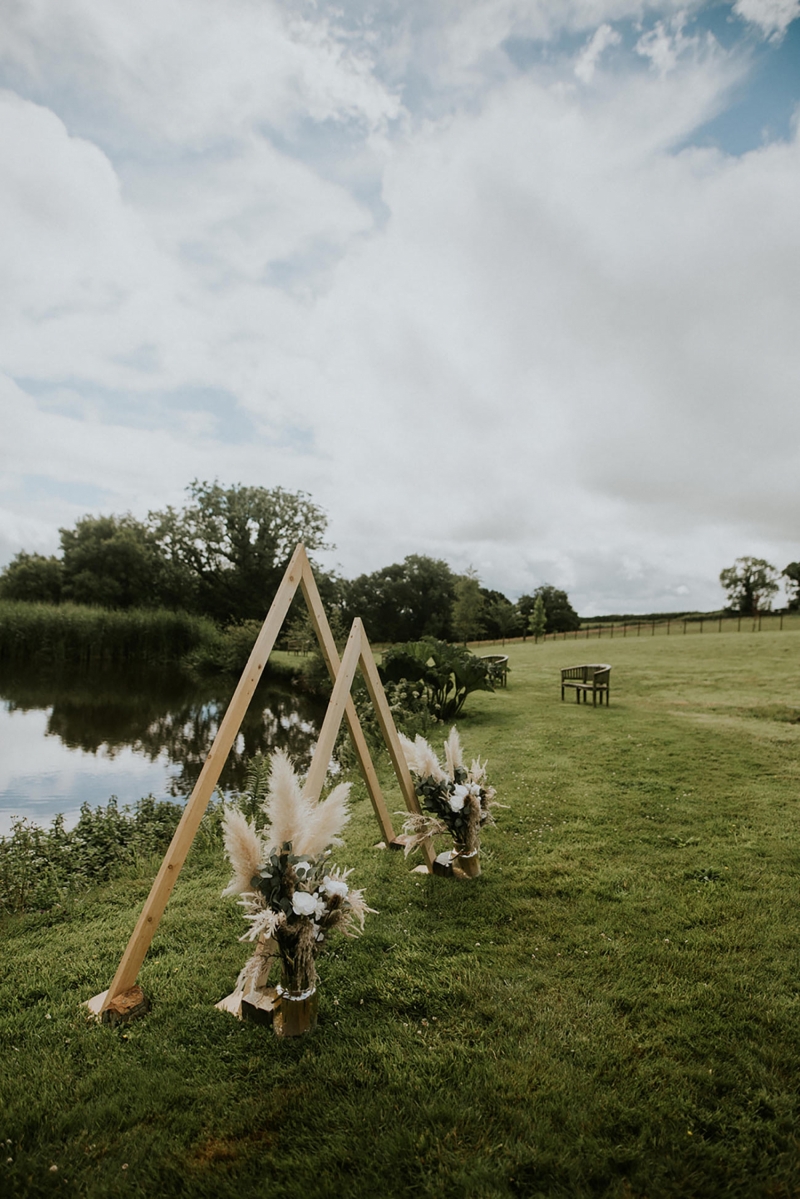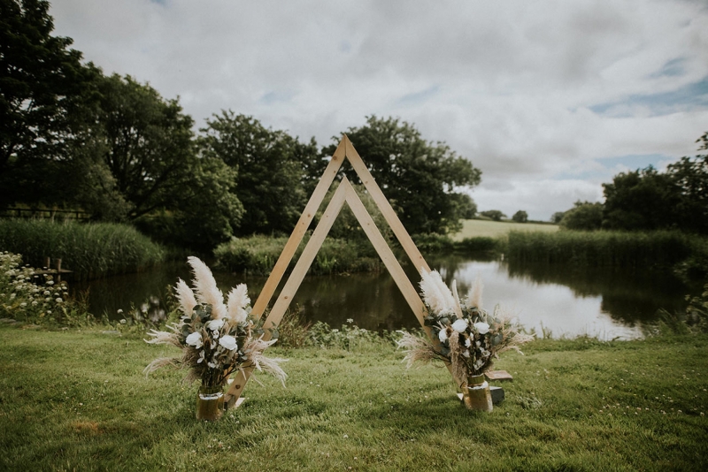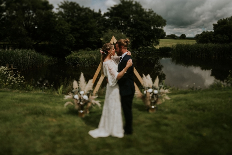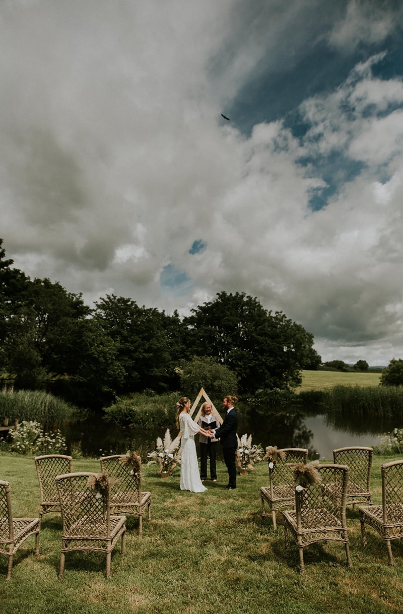The venue requires little styling, but lends itself perfectly to bespoke weddings with individually designed decor, whether you envision an elegant celebration, boho-inspired affair or vintage glam party, all of which are reflected in the shoot. The ceremonial space is simply arranged with wicker chairs adorned with miniature posies of dried flowers as the couple utter their vows in front of the lake and a striking wooden triangular frame flanked by neutral florals, all evoking a full immersion in the awe-inspiring landscape.